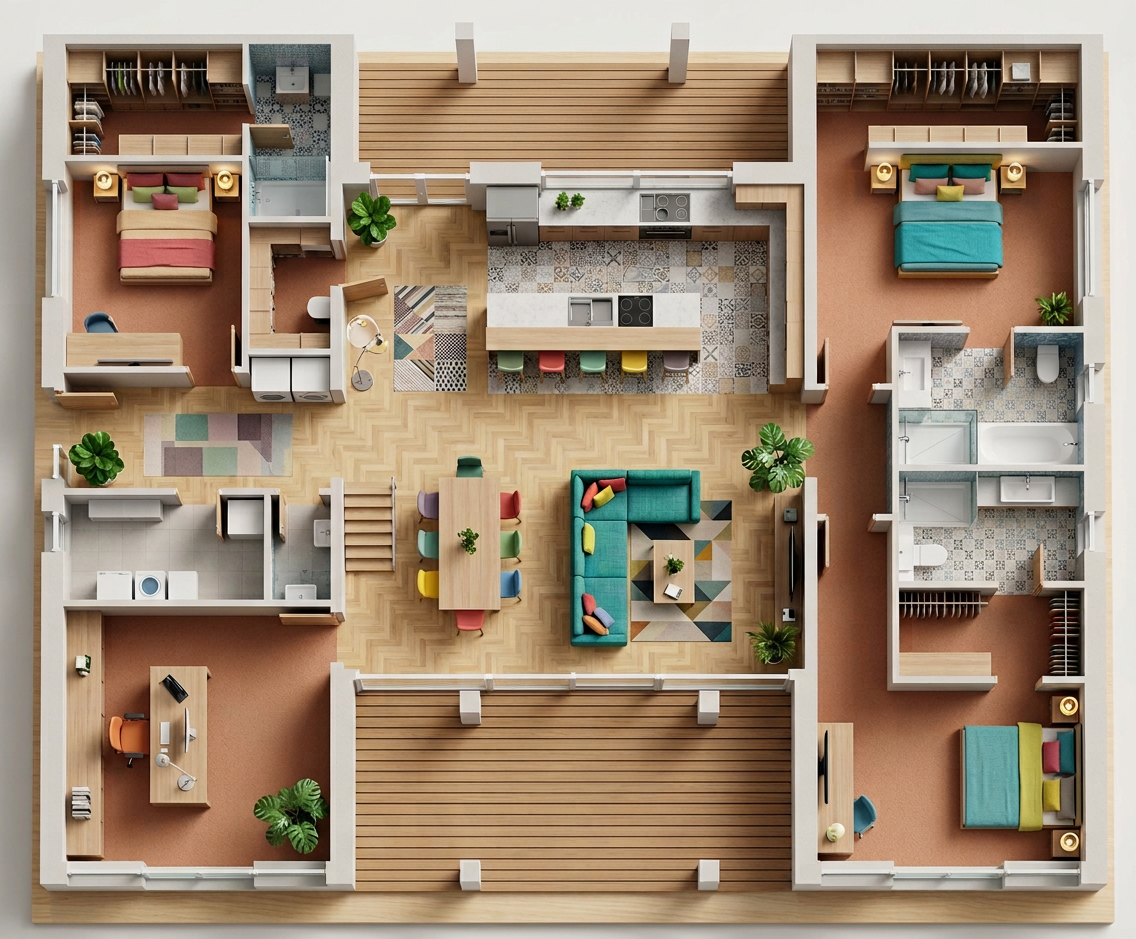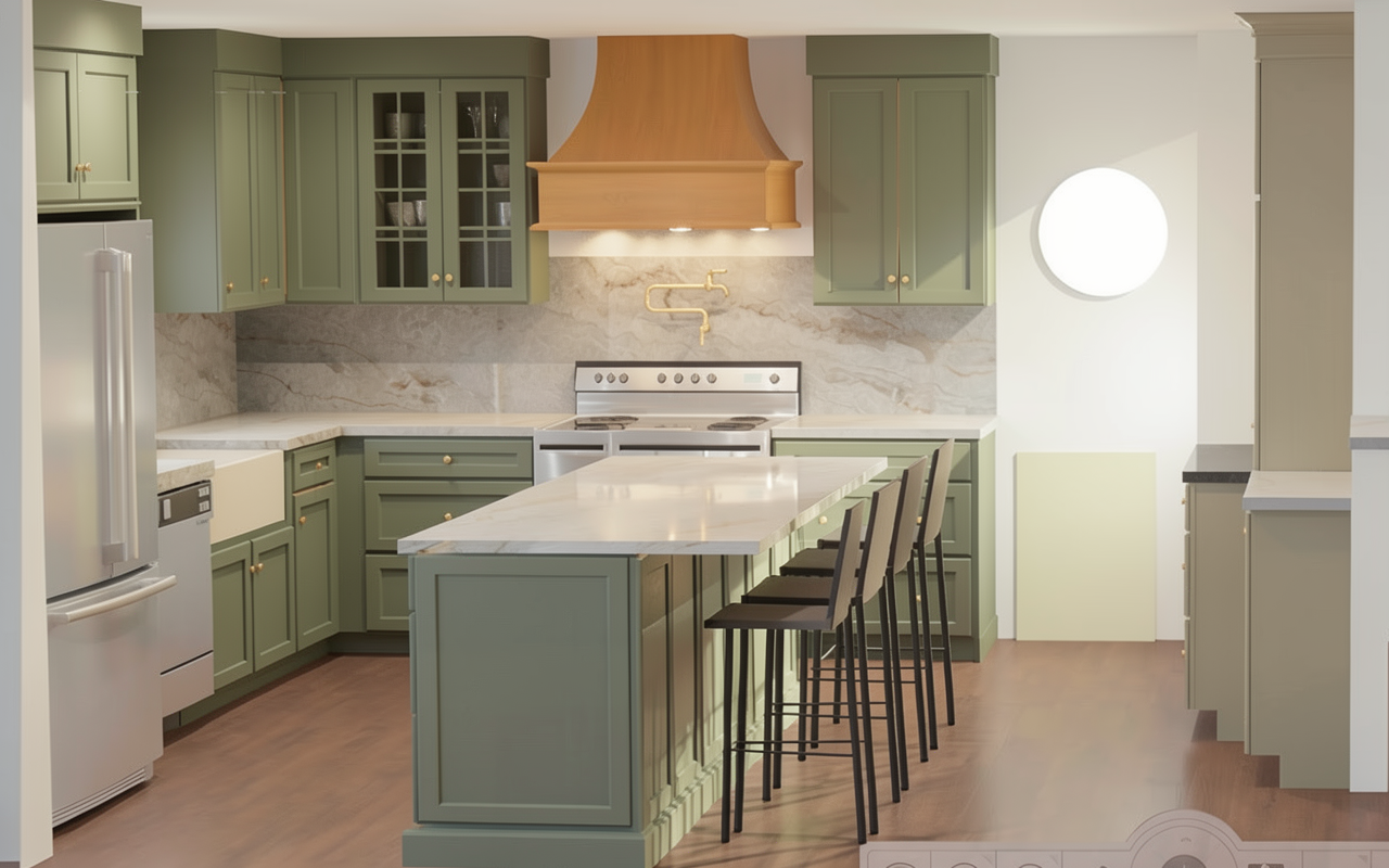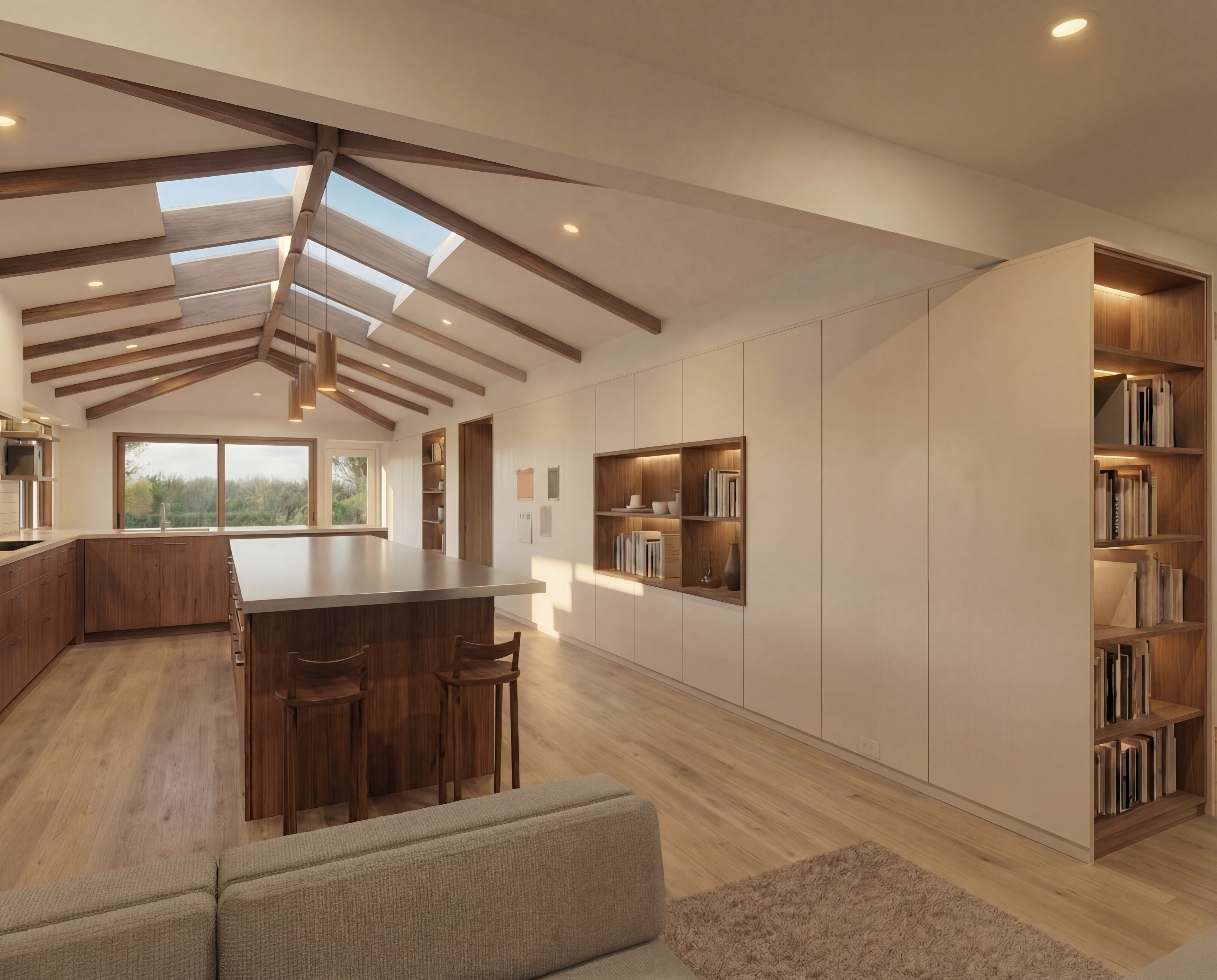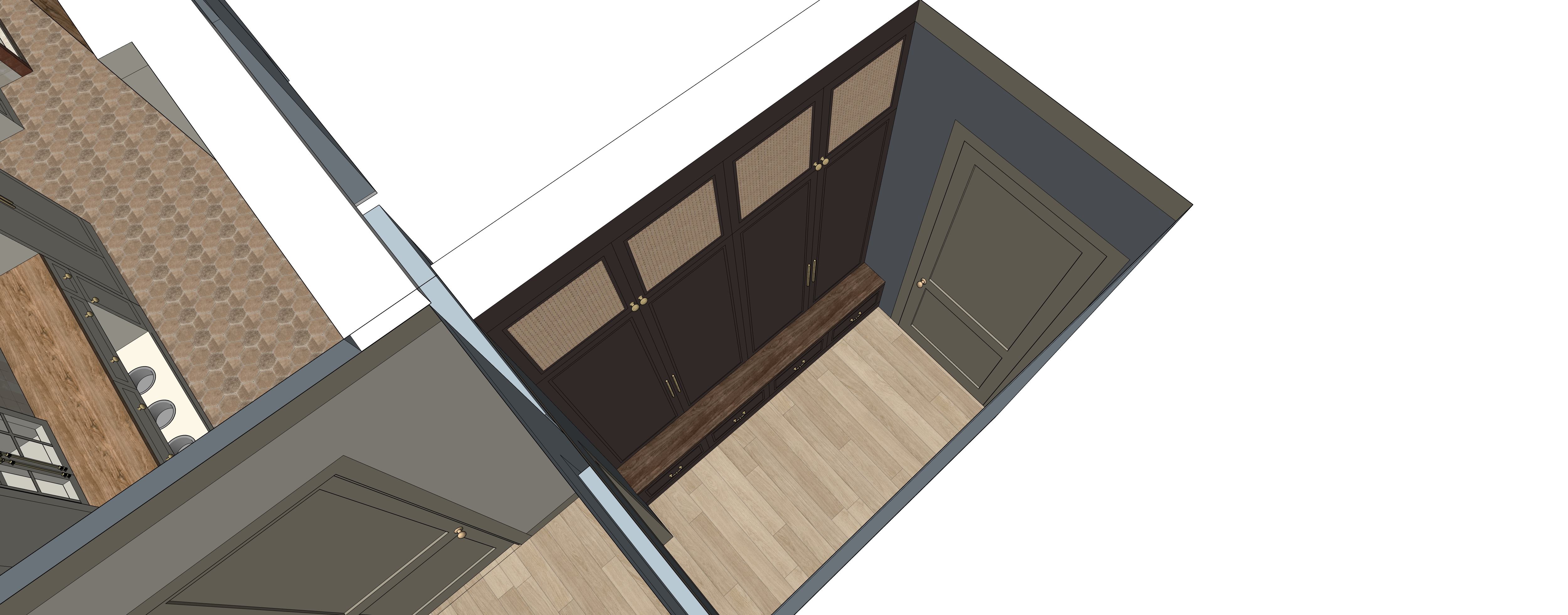 create a highly photorealistic interior rendering of a traditional mudroom using the provided reference image as a fixed architectural model the layout cabinetry bench paneling door placement flooring direction and camera perspective must remain consistent but correct the perspective to feel natural and realistic this rendering is for a finishes focused concept presentation no styling clutter the space should feel tailored warm and grounded with strong material contrast and depth camera correction critical adjust camera from top down to eye level or slightly elevated 5 6 ft maintain same general angle but remove distortion use a 28 35mm lens keep vertical lines straight no tilt distortion this is the biggest issue in the current image architecture to preserve full built in cabinetry wall with upper cane panels continuous bench with integrated drawers door placement and trim flooring layout and direction adjacent room visibility do not redesign or reposition elements materials and realism cabinetry major fix deep rich brown espresso leaning warm not black add visible wood grain and tonal variation matte finish cane panels natural woven cane texture warm honey tone slight irregularity and depth not flat or printed cabinets should feel like furniture not a solid mass bench same wood tone as cabinetry slight wear variation on surface matte finish subtle highlight along front edge flooring currently too flat light natural wood tone add variation plank to plank visible grain and slight tonal shifts matte finish avoid uniform beige needs movement walls trim soft warm neutral not gray matte finish subtle shadowing at panel edges door slightly deeper tone than walls satin matte finish add edge definition and shadowing lighting depth realism fix natural light soft daylight coming from adjacent space left side gentle directional falloff ambient light warm soft fill do not evenly light all surfaces shadow behavior add soft shadows under bench cabinetry toe kicks slight deepening in corners this will ground the cabinetry and remove flatness lighting temperature 3200 3700k warm neutral contrast depth important increase contrast between dark cabinetry light flooring neutral walls avoid everything reading mid tone styling minimal optional one folded textile or basket on bench otherwise keep clean rendering style professional architectural interior photography warm slightly moody strong material realism matte finishes no glossy cg look no flat lighting geometry guardrail treat the model as fixed do not move cabinetry do not change layout do not alter proportions only improve materials lighting camera realism
