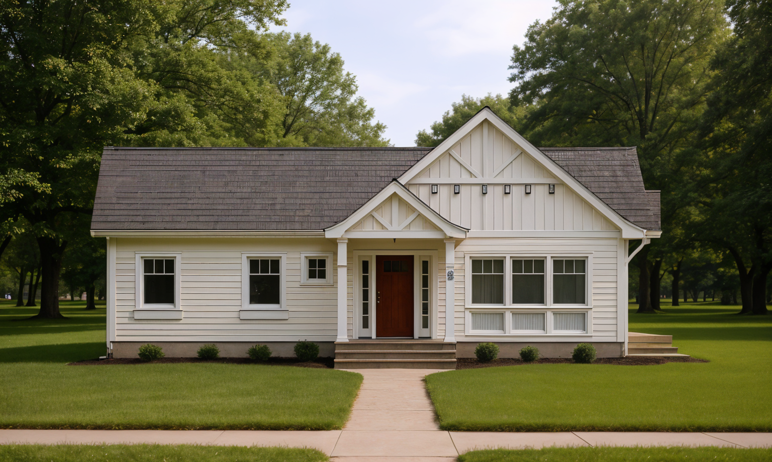 exterior shot creamy white brick and siding cream windows beige roof in a forest