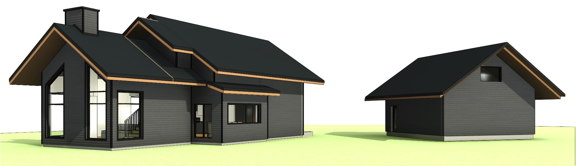 partir de cette image en conservant strictement et sans modification les couleurs bois noir et brun le toit en rev tement m tallique noir et le sens des rev tements visibles sur l image de r f rence ne pas interpr ter ni remplacer les mat riaux teinte texture orientation conserver exactement les volumes et proportions du b timent on voit la maison de dos pas de chemin en facade pas de chemin int grer le b timent dans un environnement naturel cr dible avec une v g tation typique du qu bec utiliser un clairage naturel uniforme et diffus lumi re du jour clairant de fa on gale la maison et le garage avec des ombres douces et un ciel l g rement nuageux int grer le b timent dans un environnement naturel cr dible avec une v g tation typique du qu bec mettre du gazon entre la maison et le garage utiliser un clairage naturel uniforme et diffus lumi re du jour clairant de fa on gale la maison et le garage avec des ombres douces et un ciel l g rement nuageux