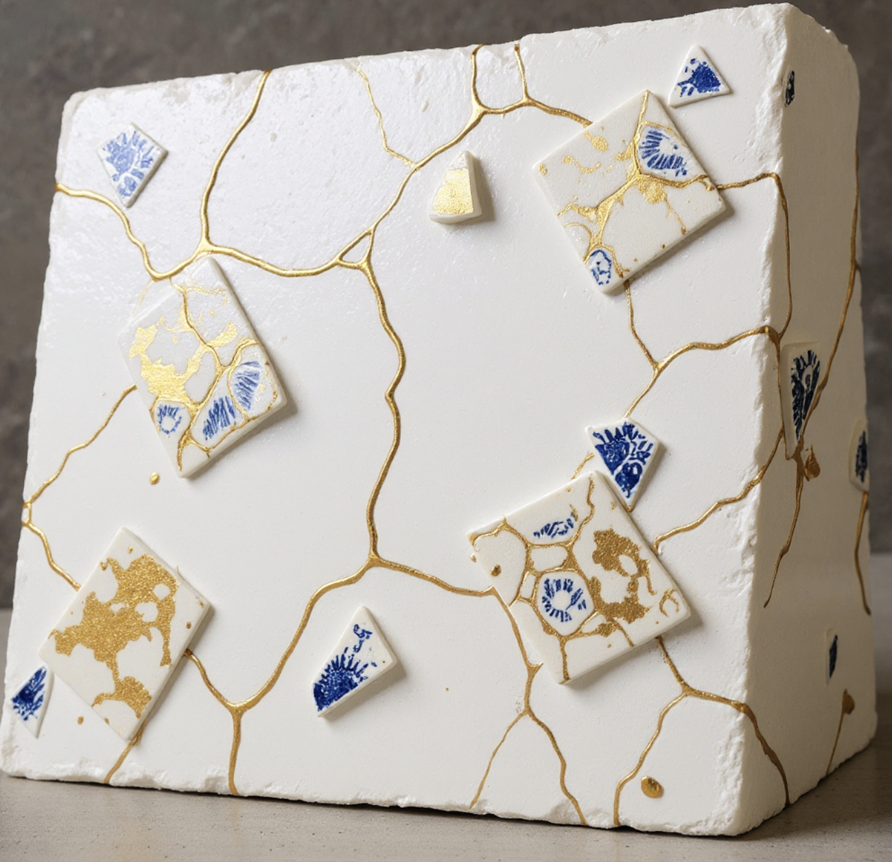 render the plaster kitchen hood with the blue and white tile pieces flush with the plaster