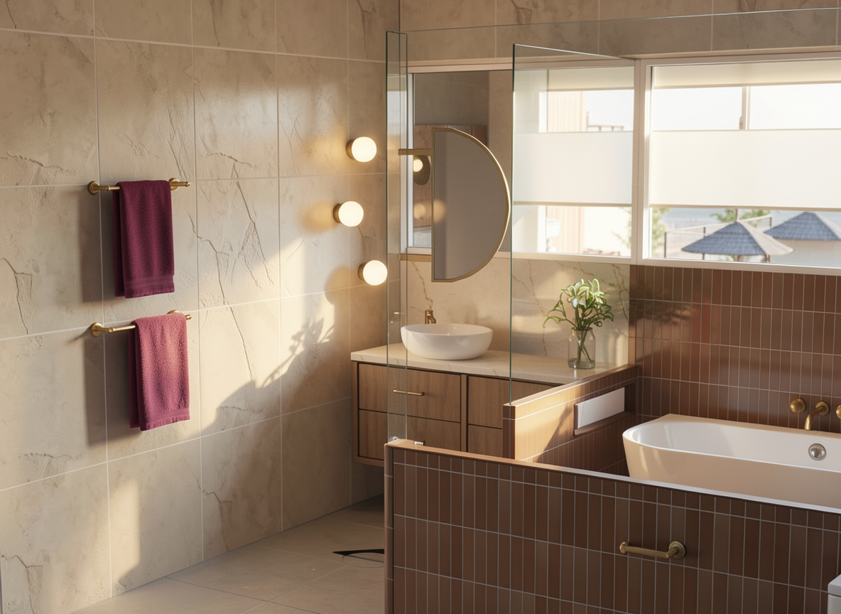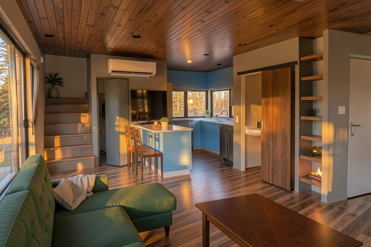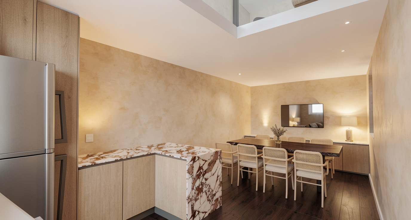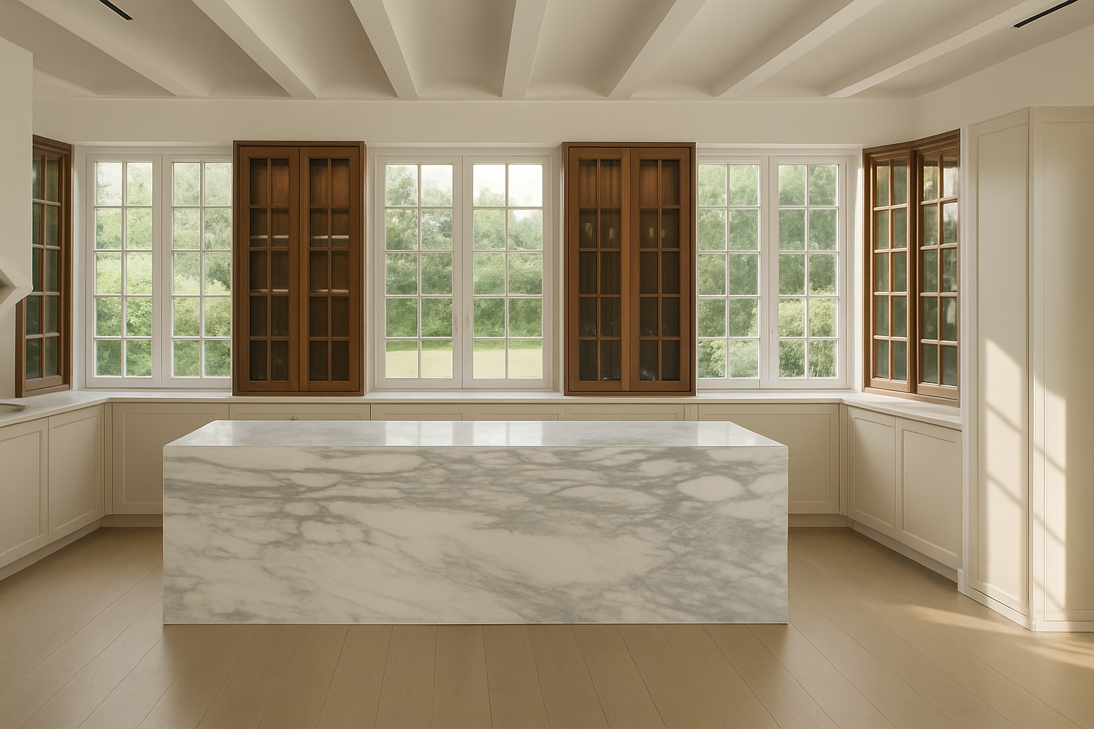interior shot change wood floors to natural stone and island marble to walnut