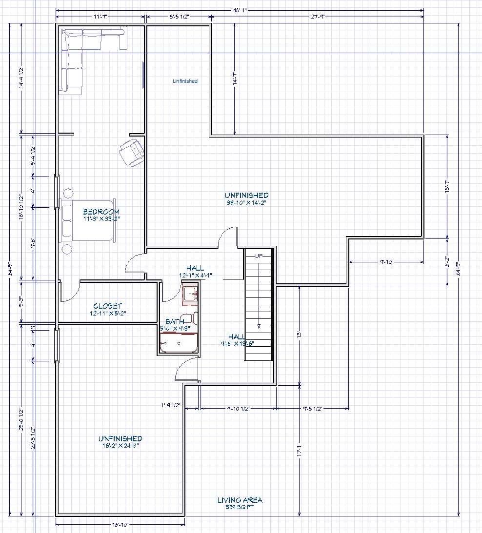 convert this floor plan into a realistic isometric 3d view of a full house show the space from an elevated angle with furniture walls and details visible there are two large rooms labelled unfinished keep those unfinished and show concrete floors and studs the bedroom is also living room are one great room include furniture use the same furniture as shows on the plan do not change the orientation of the floorplan