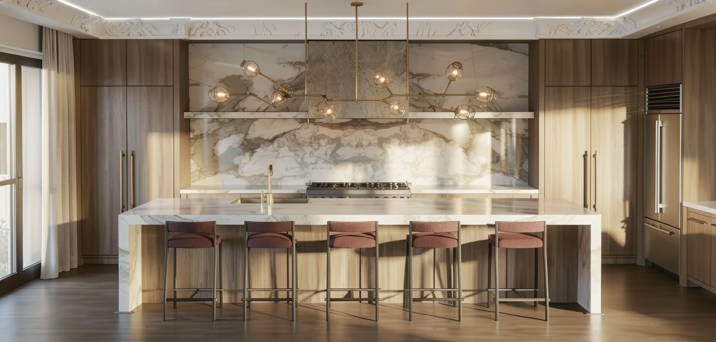 render a photorealistic cinematic interior of a restaurant the camera view faces wall nr 1 which contains three vaulted niches each niche has a black mirror back wall and two 3d printed vaulted orange panels between the frame of the niche and the black mirror wall nr 1 is clad in beige 3d printed modular panels between the left corner of wall nr 1 and the left niche there is a series of 3d printed beige rifled elements similarly between the right corner and the right niche there is a series of 3d printed beige rifled elements the left wall wall nr 2 is clad in beige 3d printed modular panels and contains a flush orange door no frames perfectly integrated with the wall panels the right wall wall nr 3 is clad in floor to ceiling vertical orange 3d printed panels perfectly aligned with a flush orange door no frames the orange color is subtle and muted elegant rather than bright the ceiling is black the floor is a large scale mosaic there are six tables with chrome legs and black marble tops each table has four chairs with wooden bodies and light blue upholstery constraints do not change any geometry proportions scale layout panel stereotomy module alignment joints spacing niches doors furniture or flooring doors preserve exact geometry size position and proportions flush with panels do not add frames handles or any hardware modifications only refine material subtly for realism wall nr 3 panels vertical floor to ceiling aligned perfectly to the door preserve spacing and proportions do not add spotlights or visible fixtures preserve all colors adjusting only the orange to a muted elegant tone material and texture enhancements refine textures of all walls panels mirrors tables chairs doors and mosaic floor for realistic subtlety beige and orange 3d printed panels subtle matte texture delicate layering fine surface detail black mirrors soft elegant reflections marble tables subtle reflections realistic not overly intense wooden chairs correct grain orientation vertical on legs supports longitudinal on horizontal members with natural subtle variation lighting explicit concealed warm led strip lighting along the full perimeter of the ceiling producing soft indirect illumination across the walls and ceiling concealed warm led lighting installed between the orange panels and the black mirrors inside each vaulted niche producing a soft diffuse glow that gently highlights the niches lighting must remain hidden no visible fixtures or spotlights light should be warm cinematic soft and atmospheric producing gentle shadows subtle reflections on the mosaic floor and marble tables and enhancing depth and material realism overall atmosphere elegant inviting cinematic luxurious yet understated with soft highlights refined materials and subtle warm illumination