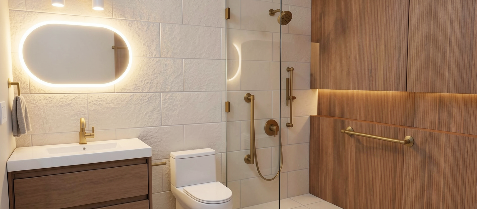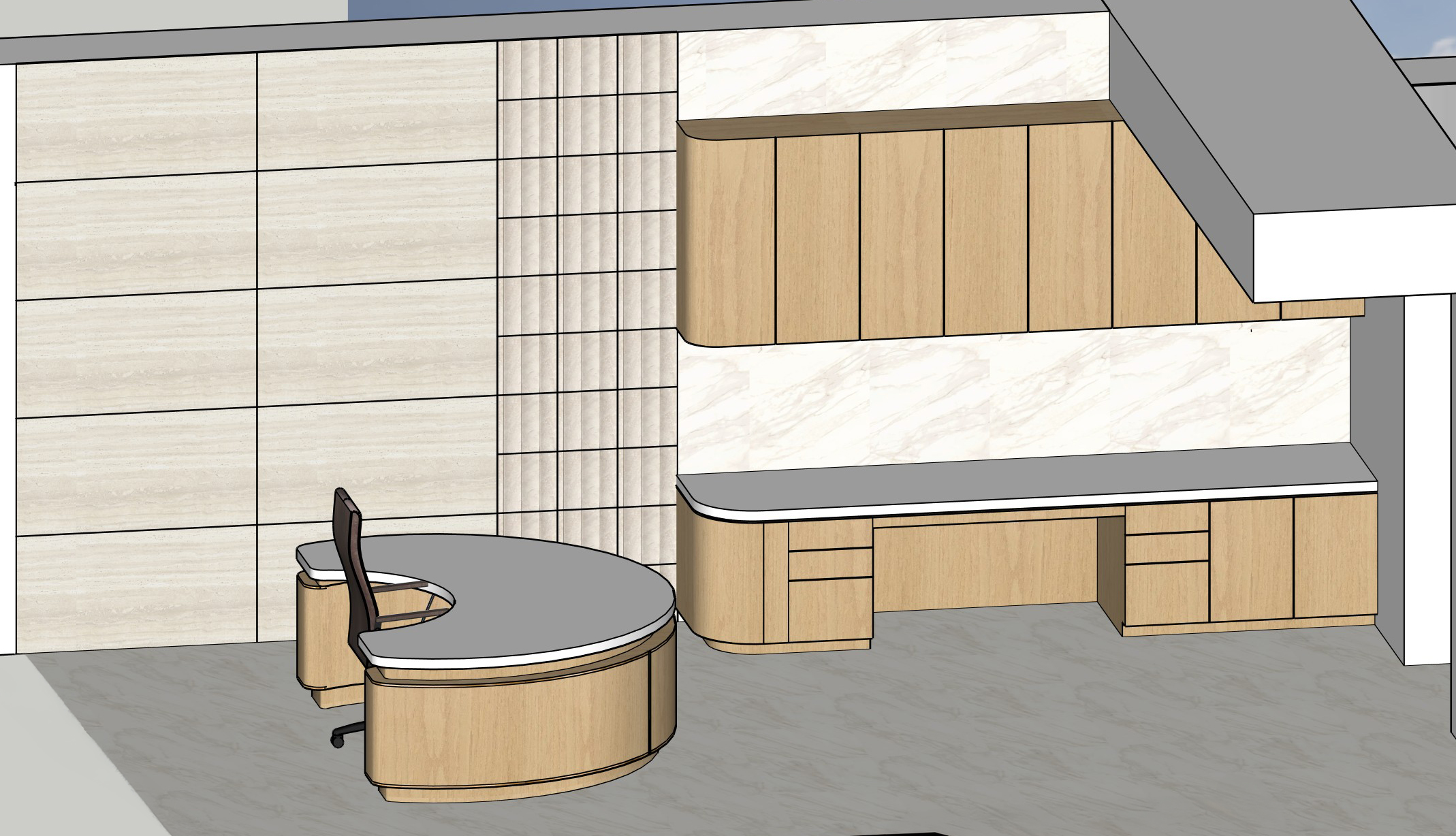 the floor is polished finish white calacatta gold marble with a subtle veining pattern the wall is ivory travertine the desk has led lights at the bottom of the wood base a light warm beige wood with brass trim details and a desktop of calacatta marble the wall cabinets are a light warm beige wood with fluted ivory travertine along the wall the walls at the cabinet are a matte finish white calacatta gold marble elegant luxury interior lighting architectural photography global illumination and a soft indirect light balance the office chair is a warm beige leather all led lights are the same color 3 000 kelvin internal illumination evenly distributed