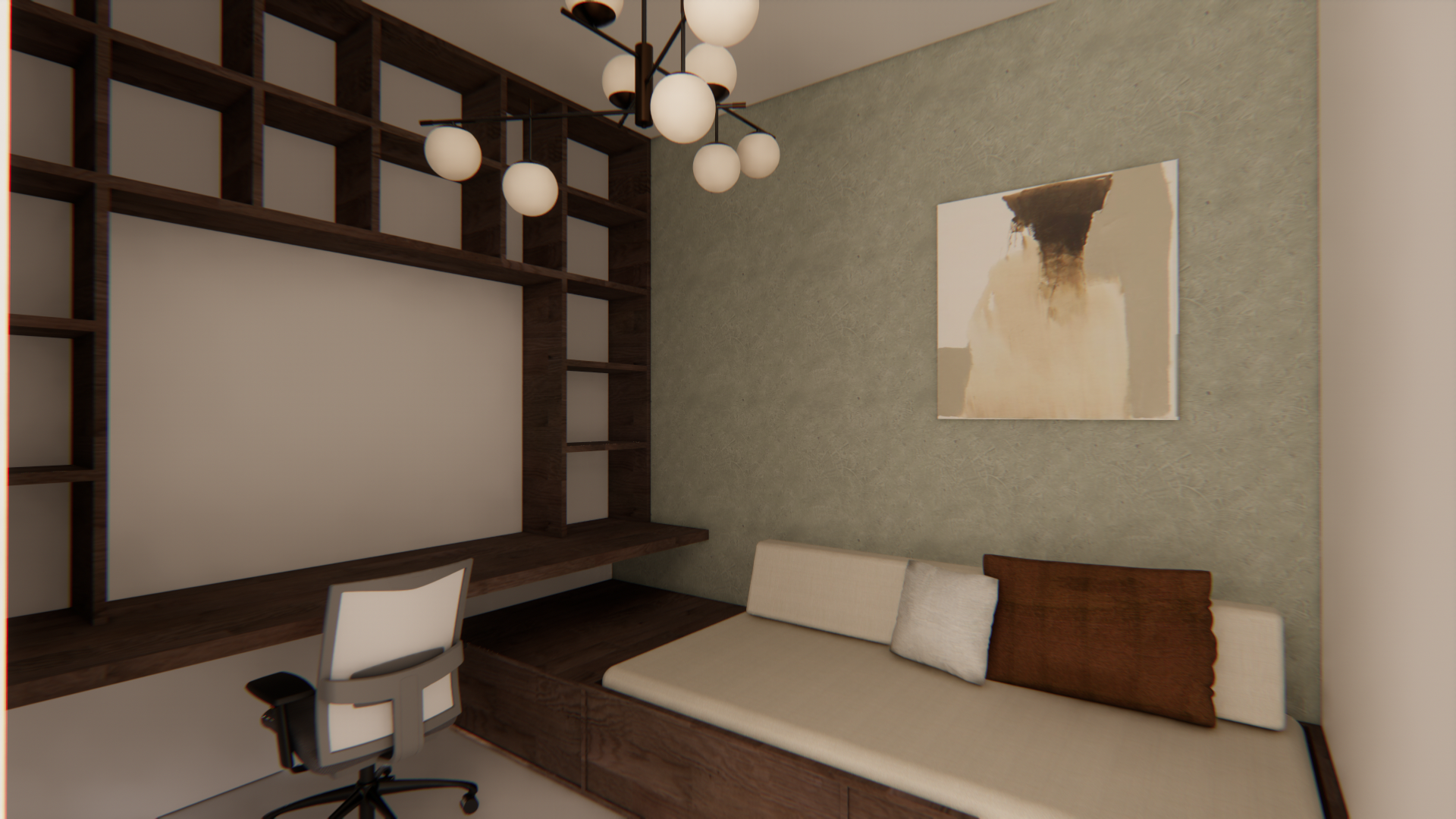 make this home office more cozy add books and decorative elements on the shelves add a computer screen keep the sofa bed as is but enhance it with fluffier cushions and no armrests adjust the green wall to a sage flat color make the image more realistic