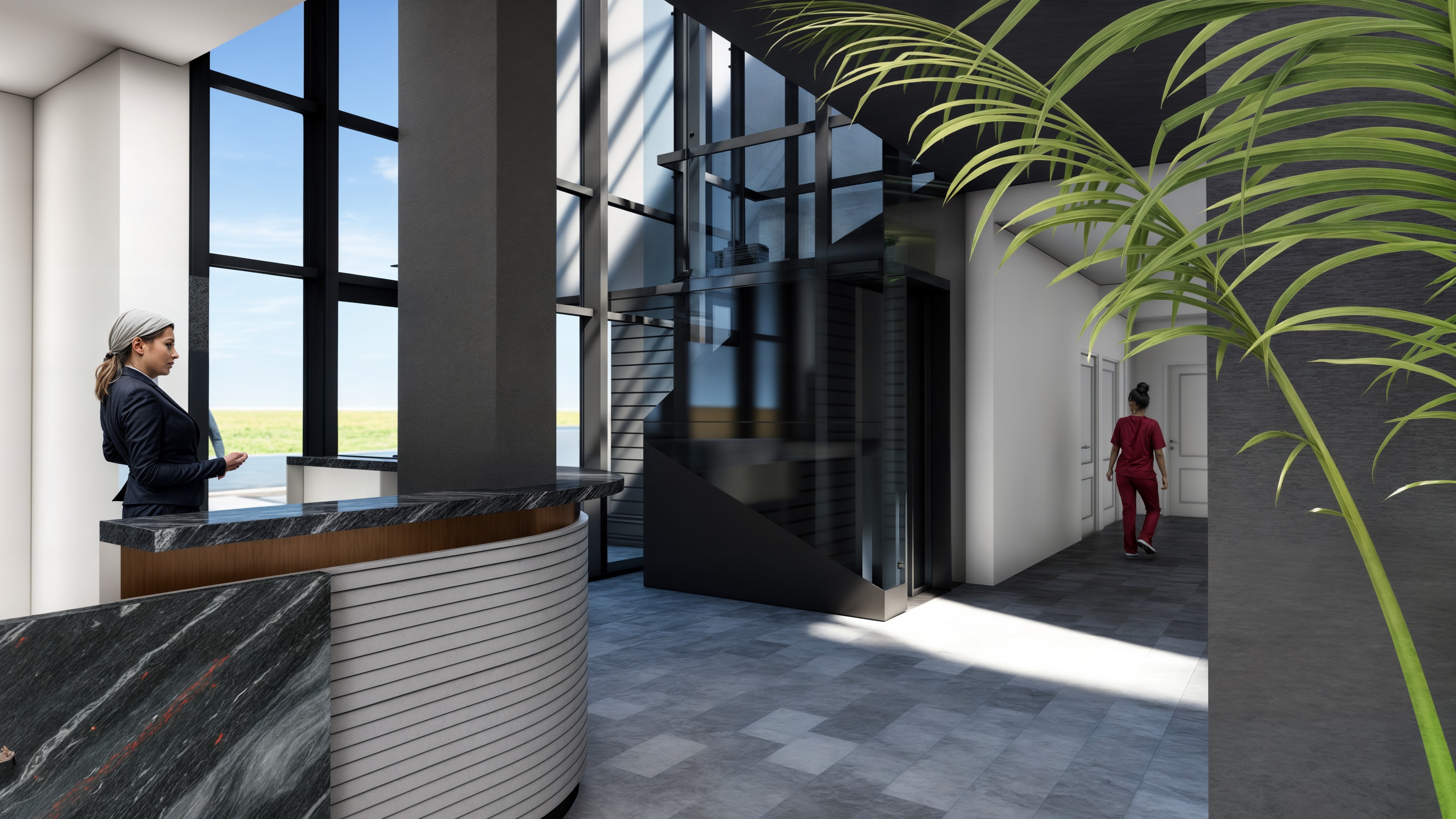 ultra realistic modern lobby interior reception area warm natural daylight through large glass facade soft ambient lighting cozy yet professional atmosphere realistic shadows detailed stone and metal textures subtle imperfections soft reflections on glass and polished surfaces high end modern materials balanced contrast photorealistic preserve original layout and architecture no major changes to structure or furniture