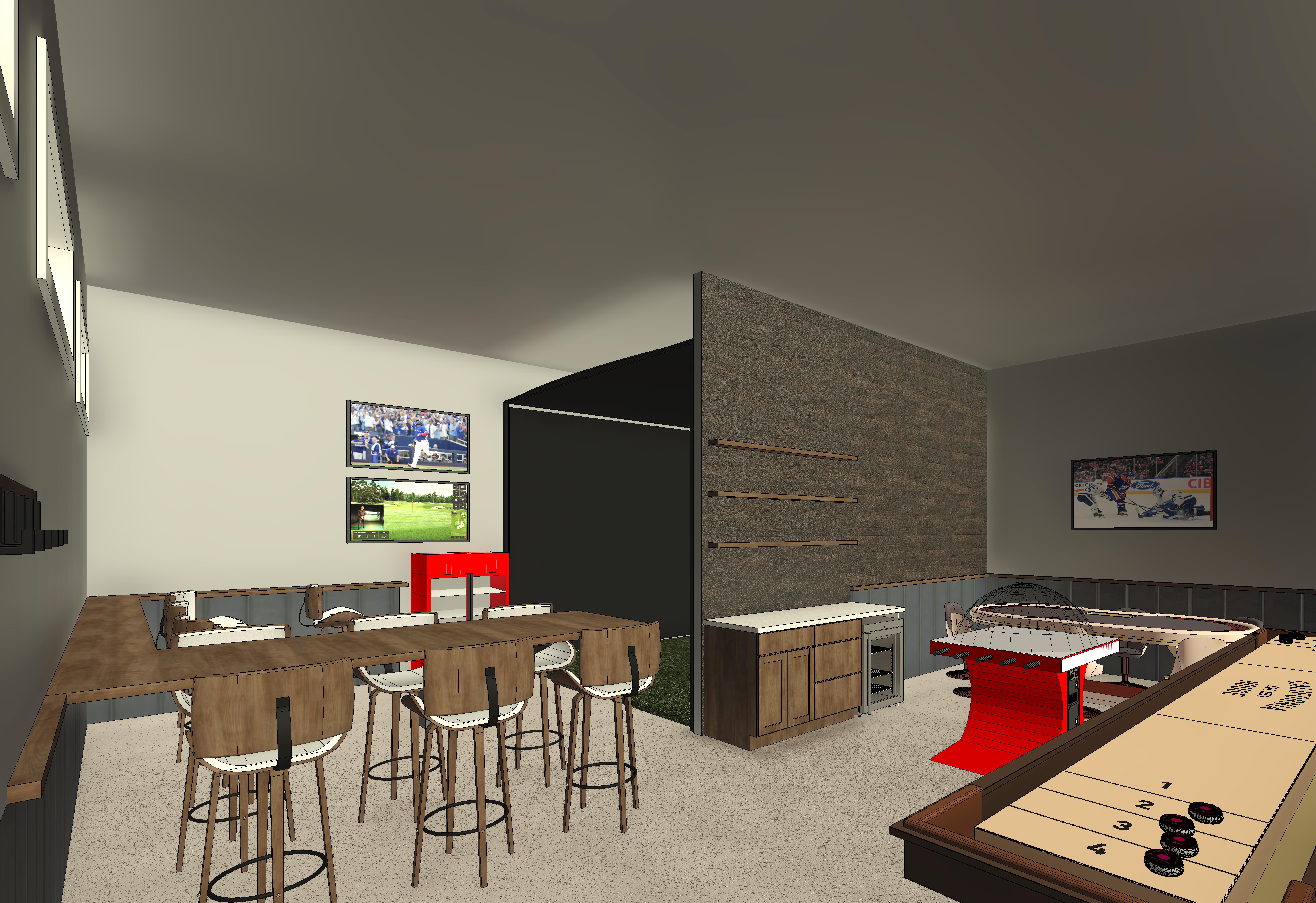 a modern rustic man cave games room the room contains a golf simulator with a fake grass green floor and black fabric walls other items include shuffleboard with black weights nhl super chexx pro bubble hockey edmonton oilers model with black base bottom and oilers logo on the base poker table behind the bubble hockey trimmed in black leather a red coca cola fridge with coca cola logo above the fridge doors fridge is full of beer organized by brand bud light kokanee and coors light the tv s on the far wall are displaying a high definition blue jays game on the top tv and a high definition golf simulator game on the bottom tv the tv on the right wall above the poker table is displaying a high definition edmonton oilers game the bottom 42 of all exterior walls are finished in galvanized vertical corrugated metal capped at the top with a small wood sill with underlighting to accent the corrugated metal no lighting at the bottom of the corrugated metal the bar wall is a feature wall finished above the corrugated metal with horizontal medium large planks of rustic reclaimed wood the other walls are painted benjamin moore simply white the cabinets against the reclaimed wood wall are a walk up bar with three open wood shelves above each shelf has a soft subtle undershelf lighting with alcohol bottles on each shelf no toe kick lighting on the bar cabinet personal ice maker on the right side of the light colored granite bar top cabinet hardware is a flat black metal finish soft natural light coming through the windows and pot lights throughout providing gentle ambient soft mood lighting make all the wood for bar cabinets bar shelving table chairs and corrugated steel trim a medium dark wood grained birch the floor should be a medium dark gray cut and polished concrete floor do not crop the view change nothing else add nothing else