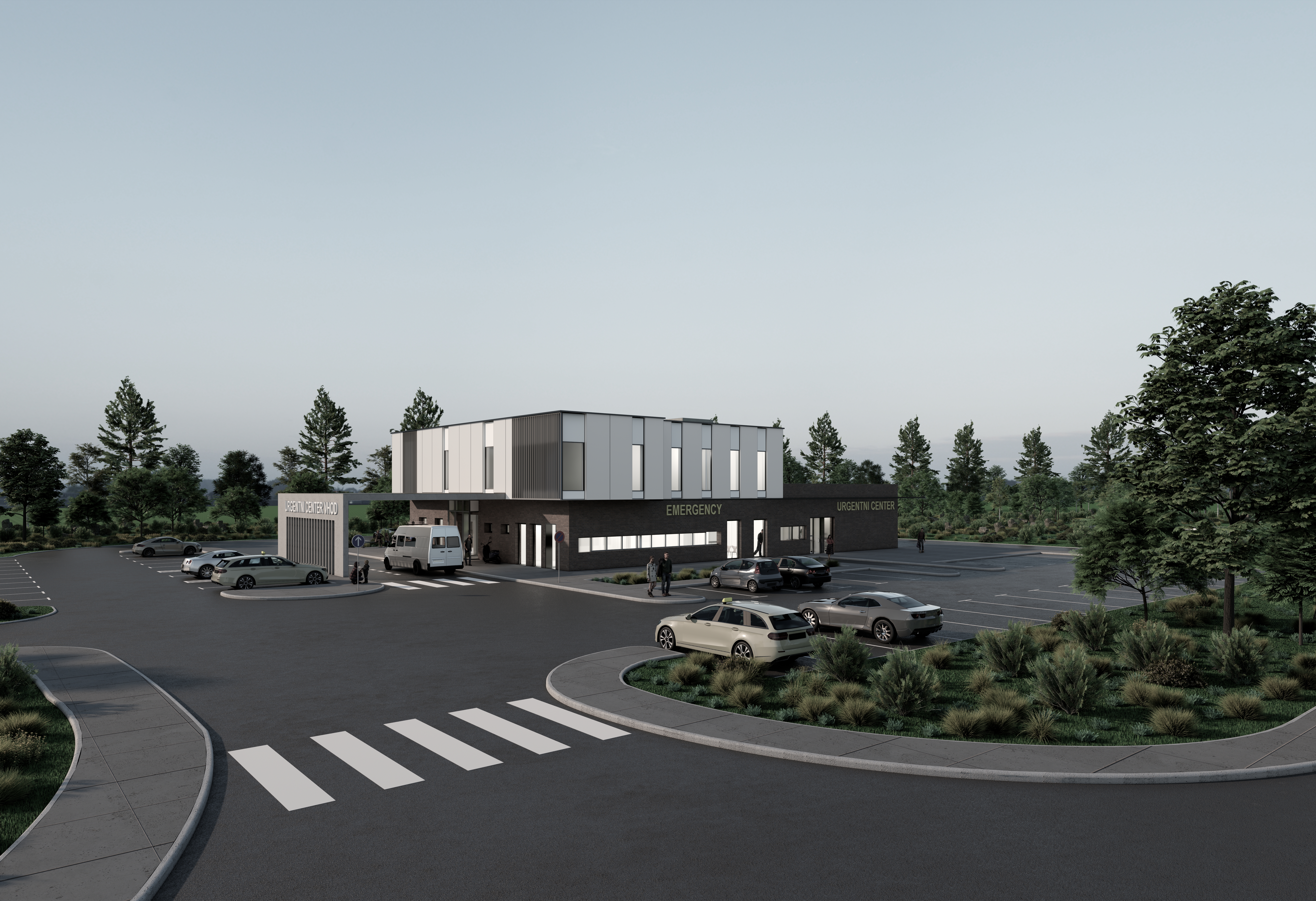 the picture shows a new emergency station and a bright autumn rainy day the sun is slightly shining through the clouds iunder the canopy are two young female doctors people are walking with open umbrellas near the building the emergency vehicle has its emergency lights on in the wet areas in front of the building you can see reflections of the sky and nature and the building behind the building is an autumn colored forest the light of the picture is slightly cold it is a little raining the vehicles have their lights on under the canopy is a white van with the markings of the emergency vehicle