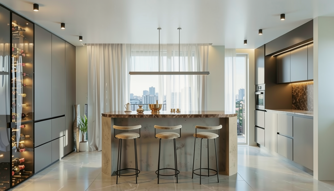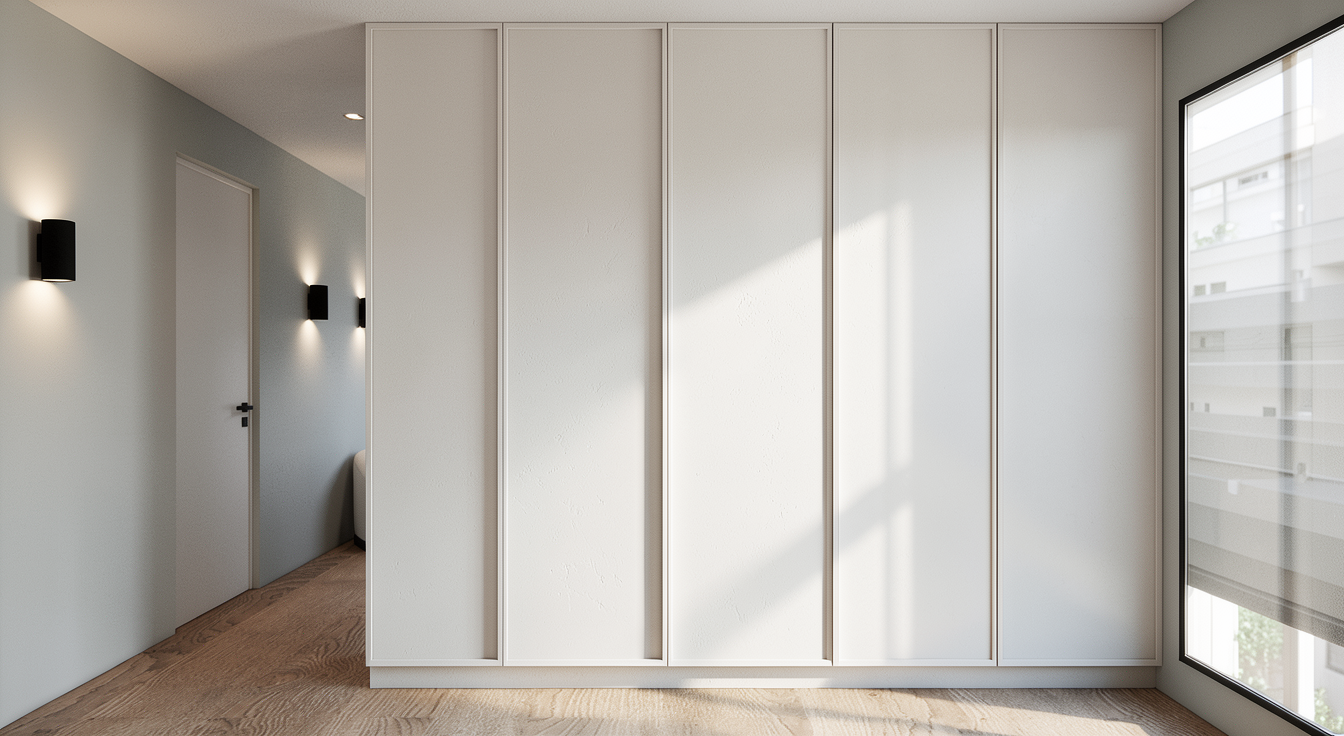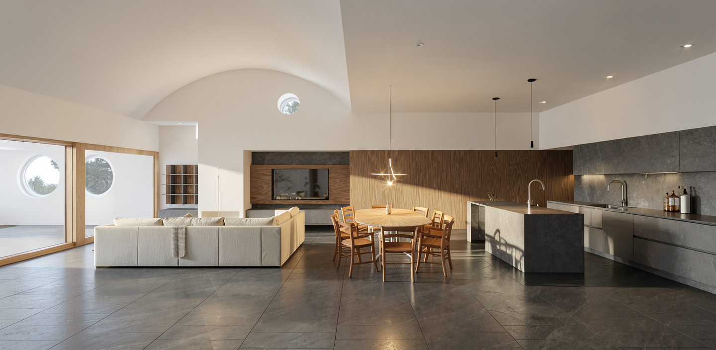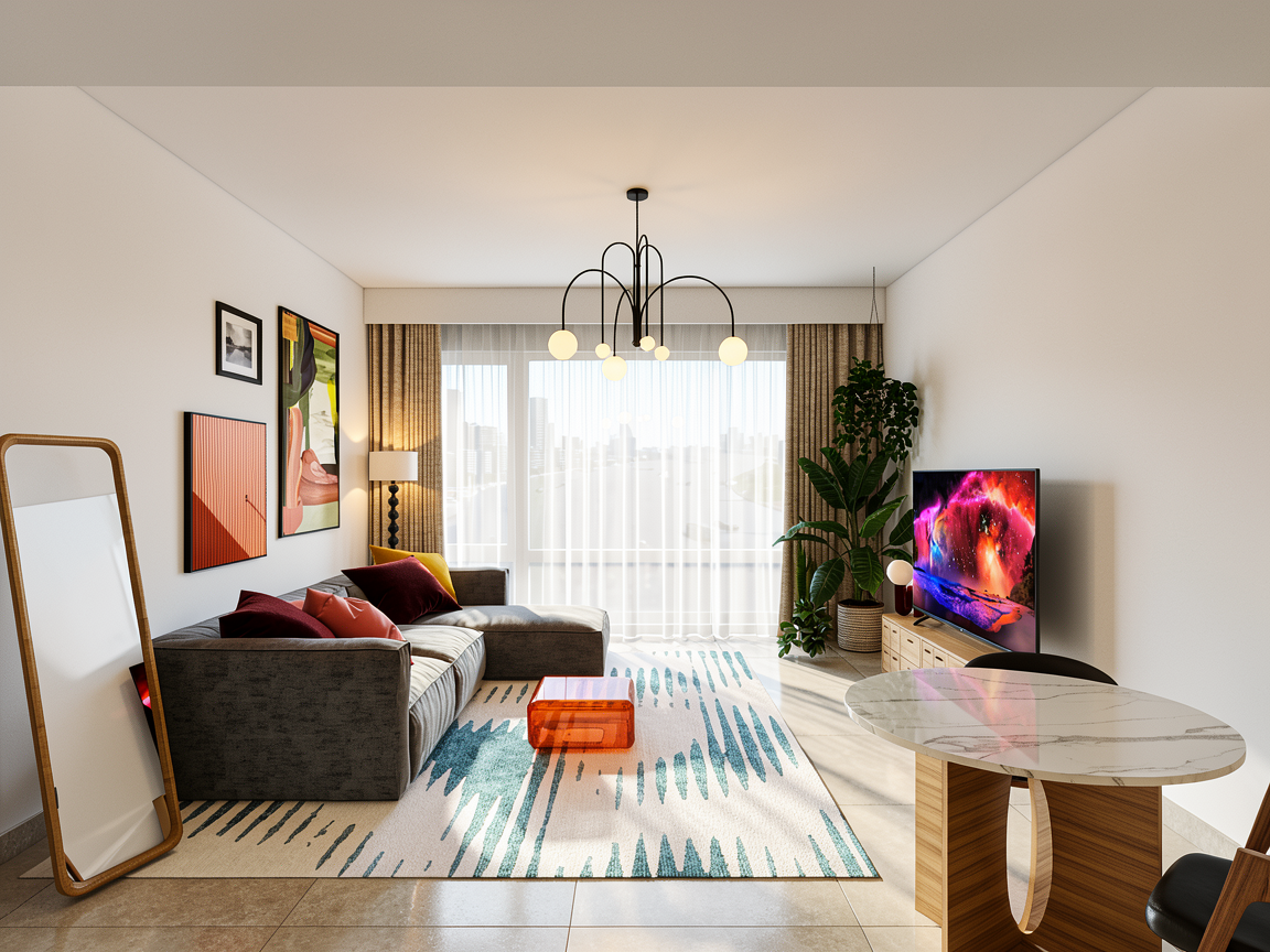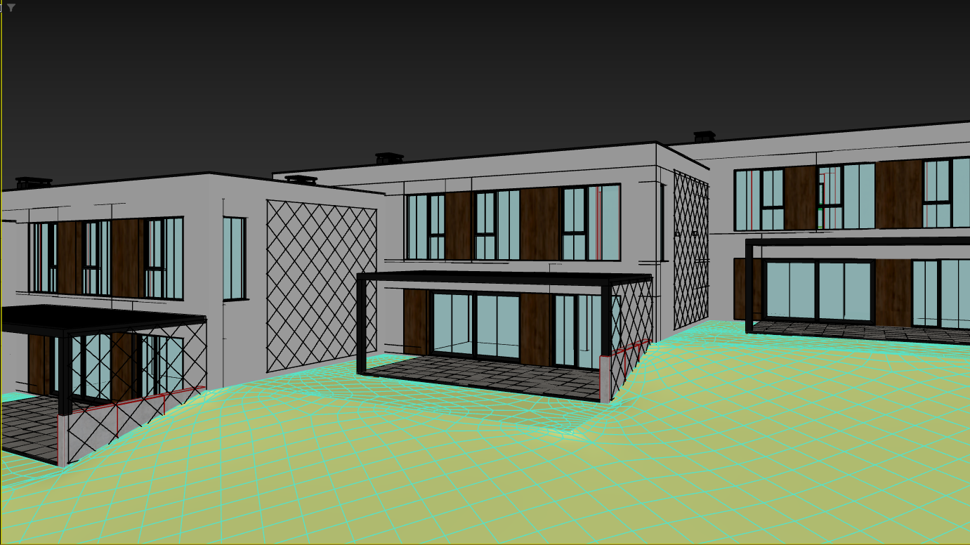 exterior shot make white facade with white stucco make brown element between windows with corten tiles add exterior furniture add ivy plants on the facade with net add interior add people enhance materials daylight environment keep geometry unchanged keep perspective unchanged