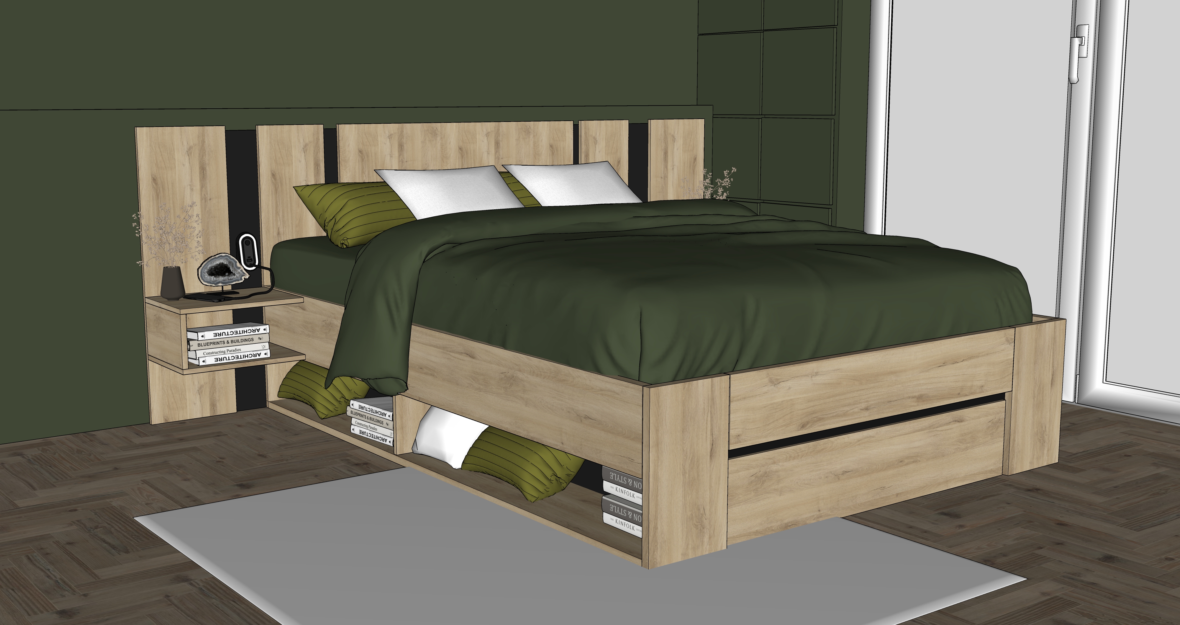 chambre moderne et chaleureuse au design naturel grand lit avec drap beige couvertures vert fonc et coussins assortis mur d coratif vert textur plantes tombantes fix es en hauteur suspensions avec ampoules vintage en verre sol en bois clair grand tapis gris chaussures dans les niches basses du lit ambiance cosy style contemporain et minimaliste rendu photor aliste haute r solution