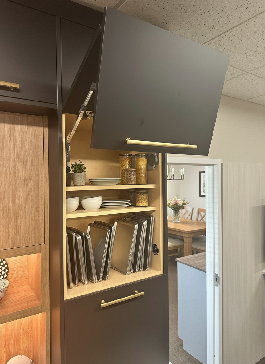 add natural kitchen lighting and make the ceiling drywall stage the shelves put cookie sheets in the metal dividers change the scene on the right to be an open dining room only