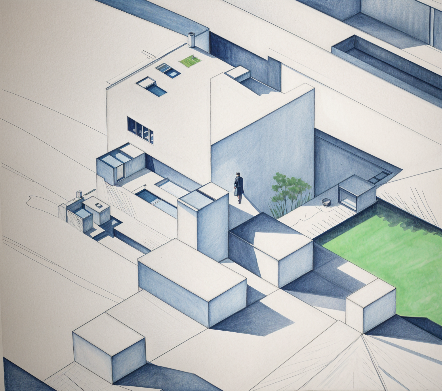 nicholas grimshaw interior shot handsketched black pharmacist and handsketched pharmacy architecture