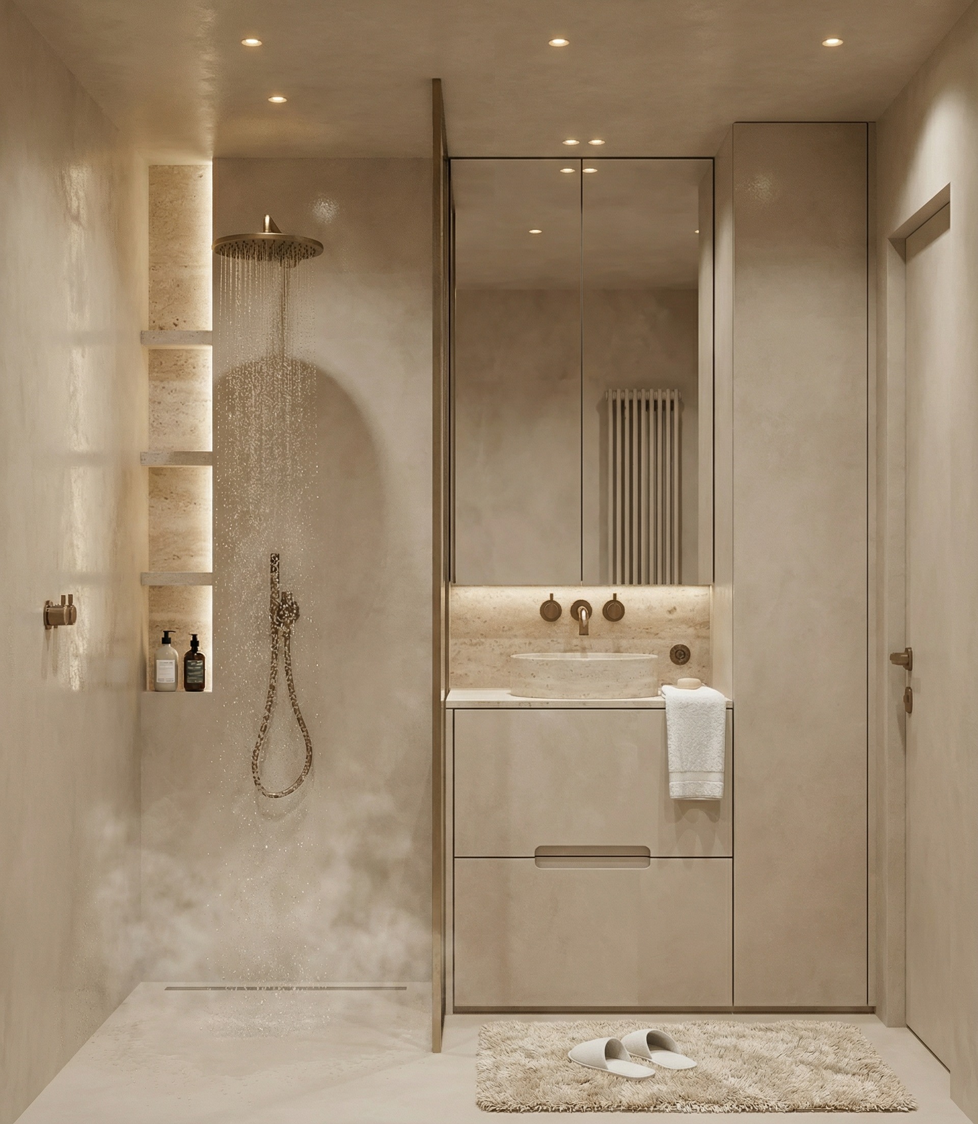 strict camera match material realism locked no redesign create an ultra high end photorealistic architectural bathroom interior render based strictly on the uploaded reference image the complete spatial layout architecture dimensions proportions ceiling height niche geometry cabinetry glass partition shower zone vanity composition mirror placement circulation camera position viewing angle lens feeling framing and perspective must remain 100 identical to the reference image this is a material lighting and realism upgrade only no redesign no reinterpretation no repositioning no camera change treat the reference image as a camera matched architectural backplate camera composition absolute lock camera position must be identical to the reference same height same distance same crop same framing same lens feeling 24 28mm full frame same horizon line and vanishing points same foreground midground background relation perfect verticals no distortion no zoom no pan no rotation no reframe architecture fixed elements keep all walls floor ceiling niches shower zone glass partition vanity drawers mirror cabinet column unit door drainage shelves and fittings exactly as in the reference image no geometry changes no depth changes no alignment changes shower glass only as shown no added door drain shape identical all radii and rounded edges must remain and be clearly readable mirror cabinet seam must be visible back wall behind basin and mirror must be perfectly flush same plane no step walls floor ceiling door all walls all shower walls floor ceiling and door finished in beige mortex seamless application subtle tonal movement micro texture and hand troweled depth matte but not flat no visible tiling no concrete look ceiling spots painted in the same mortex color must emit visible realistic light beams cabinetry built in elements all cabinetry in mortex beige column cabinet in mortex vanity cabinet in mortex shower niche structure in mortex shower niche shelves also in mortex critical the integrated recessed handle must remain 100 identical in shape position and proportion no redesign of fronts no new lines no simplification stone surfaces strictly limited only the following elements are stone vanity worktop travertino classico back wall behind basin mirror travertino classico only the back panel inside the shower niche travertino classico no other shower walls in stone stone properties satin honed finish correct vein scale subtle pore structure soft reflections no gloss no harsh contrast natural variation sanitary metals all tapware shower head hand shower mixers controls and accessories in brushed bronze warm metallic tone subtle anisotropy physically correct reflections no chrome look no plastic shine sink satin lacquered same color as mortex soft reflection ceramic feel radiator in mirror reflection mortex painted same color as walls high vertical model glass mirror shower partition clear glass frame lacquered in same color as walls real thickness soft edge reflections mirror mirror cabinet vertical seam visible realistic depth correct reflection behavior mirror reflection must show a mortex wall and mortex painted high radiator lighting architectural functional ceiling spots painted in mortex color must emit visible warm neutral light realistic light cones correct falloff soft shadows shower niche lighting one vertical led strip on the right side of the shower niche full height soft indirect glow reveals travertine texture no led under the mirror no led behind or around the mirror no extra hidden lighting elsewhere lighting must sculpt surfaces and reveal microstructure accessories broken white towel placed on the vanity worktop left of basin rattan mat on floor in front of vanity width of lower column cabinet white bath slippers placed on the mat keep all sanitary elements identical to reference material realism finish control critical mortex soft mineral diffusion subtle tonal clouds micro relief matte but alive no concrete look no repetition travertine satin reflections visible pores grazing highlights no polish no blur metals bronze warm hue shift brushed directionality correct fresnel soft highlights sink lacquered soft satin sheen no mirror reflection no plastic look glass mirror correct ior natural reflections realistic edge behavior render quality ultra photorealistic 4k sharpness physically based rendering correct roughness maps normal micro bump detail accurate global illumination no ai smoothness no over sharpening atmosphere warm calm architectural spa like high end residential bathroom soft controlled lighting serene and timeless negative prompt always add cgi look render look illustration sketch style cartoon style flat lighting harsh shadows concrete look tiled walls wrong mortex tone wrong stone glossy stone fake travertine chrome plastic materials incorrect handle changed cabinetry extra elements missing seam wrong camera different angle distortion clutter people blur low detail texture repetition