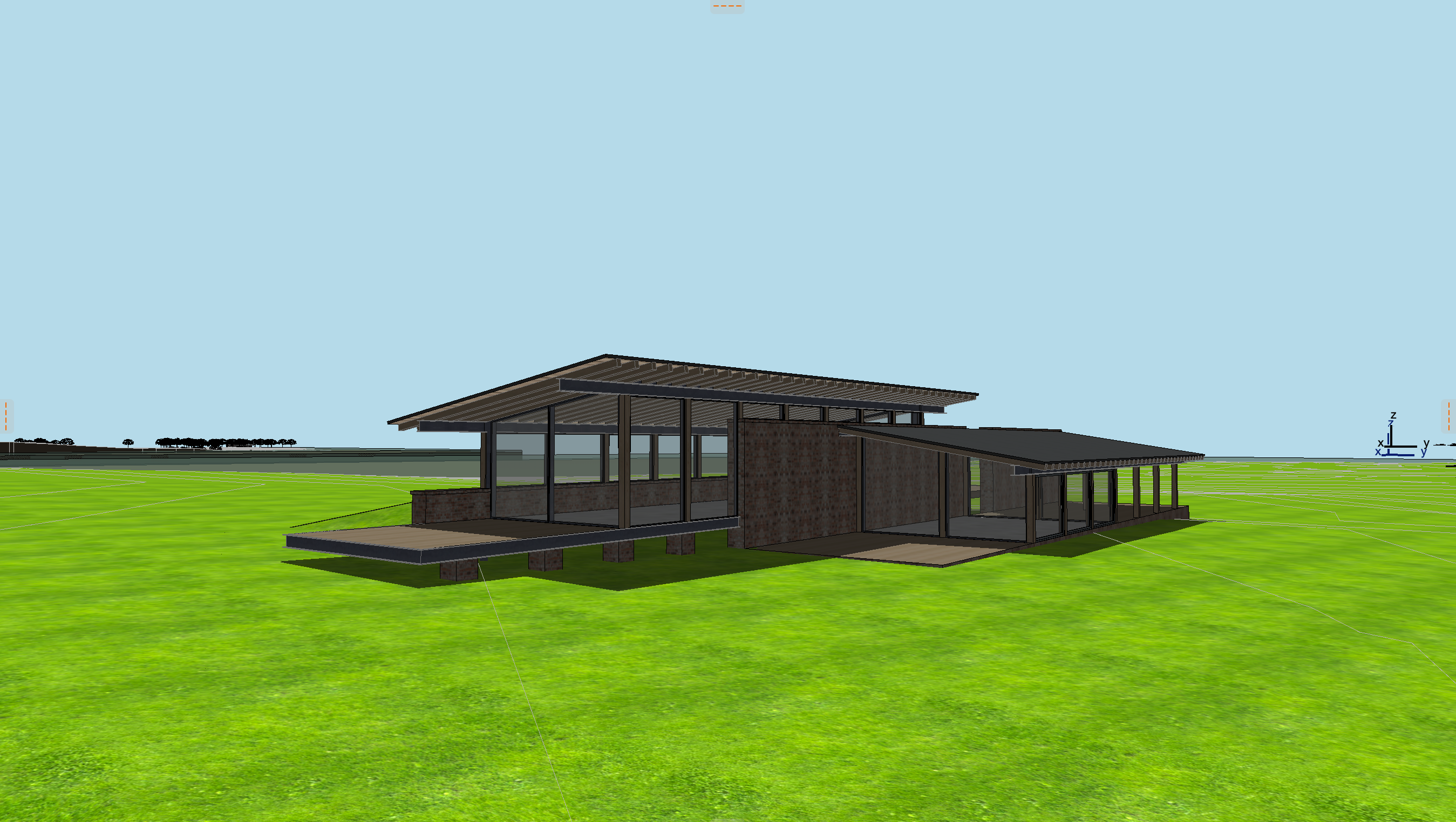antique brick house with timber columns steel beams glass windows and a standing seam roof wild lousiana grasses and vibrant wildflowers all the way to house yellow pine trees in the background lake in the distance clouds in the sky add a man and woman sitting on the edge of the elevated deck
