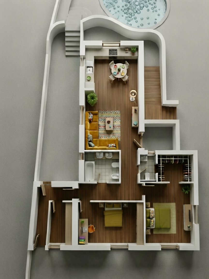 convert this floor plan into a realistic isometric 3d view of a full house show the space from an elevated angle with furniture walls and details visible change the kitchen l disposition to the right wall use the same furniture as shows on the plan do not change the orientation of the floorplan