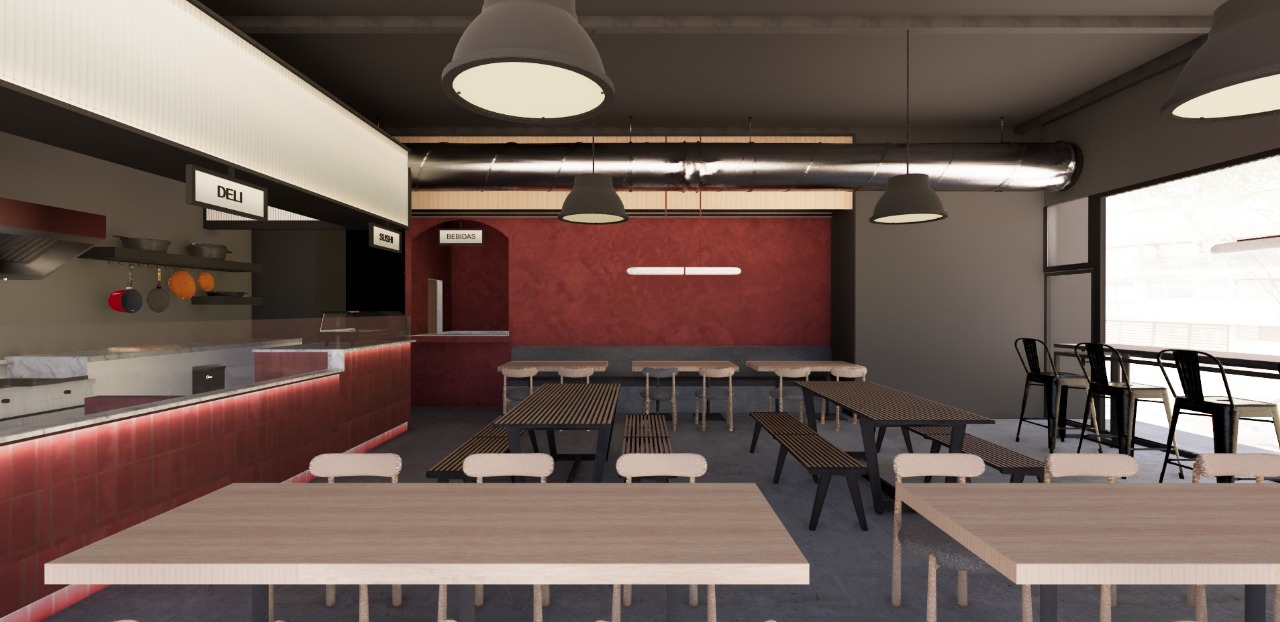 render a modern industrial style cafe interior with a warm and inviting atmosphere use deep red tones for the feature wall and counter offset by soft grays for the walls and ceiling incorporate light wood textures for the tables and benches to add natural warmth the lighting should be soft white emanating from pendant lamps creating a cozy glow while the black metal stools add a sleek contemporary edge large windows allow natural light to spill in enhancing the airy ambiance