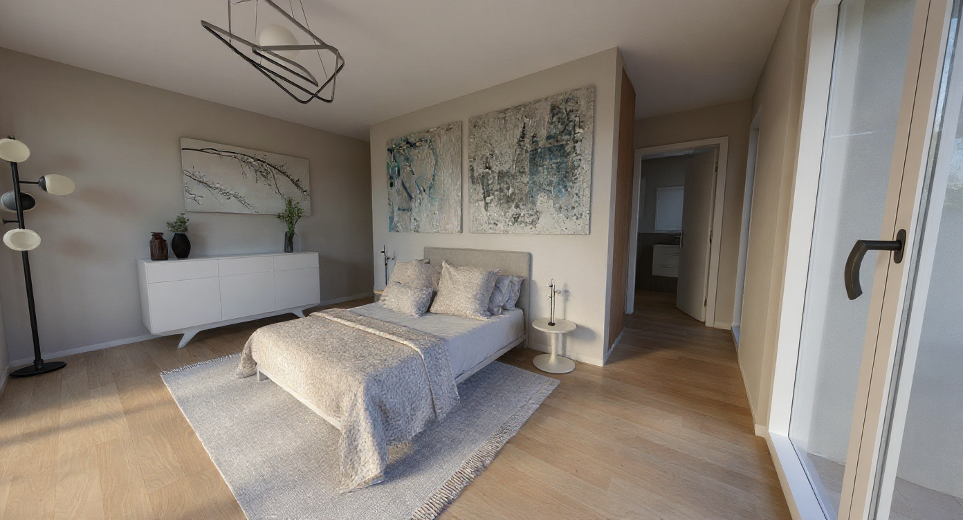 render this sketch with modern metal panel details and a nice hard scape with activity some trees around it and some people architecture