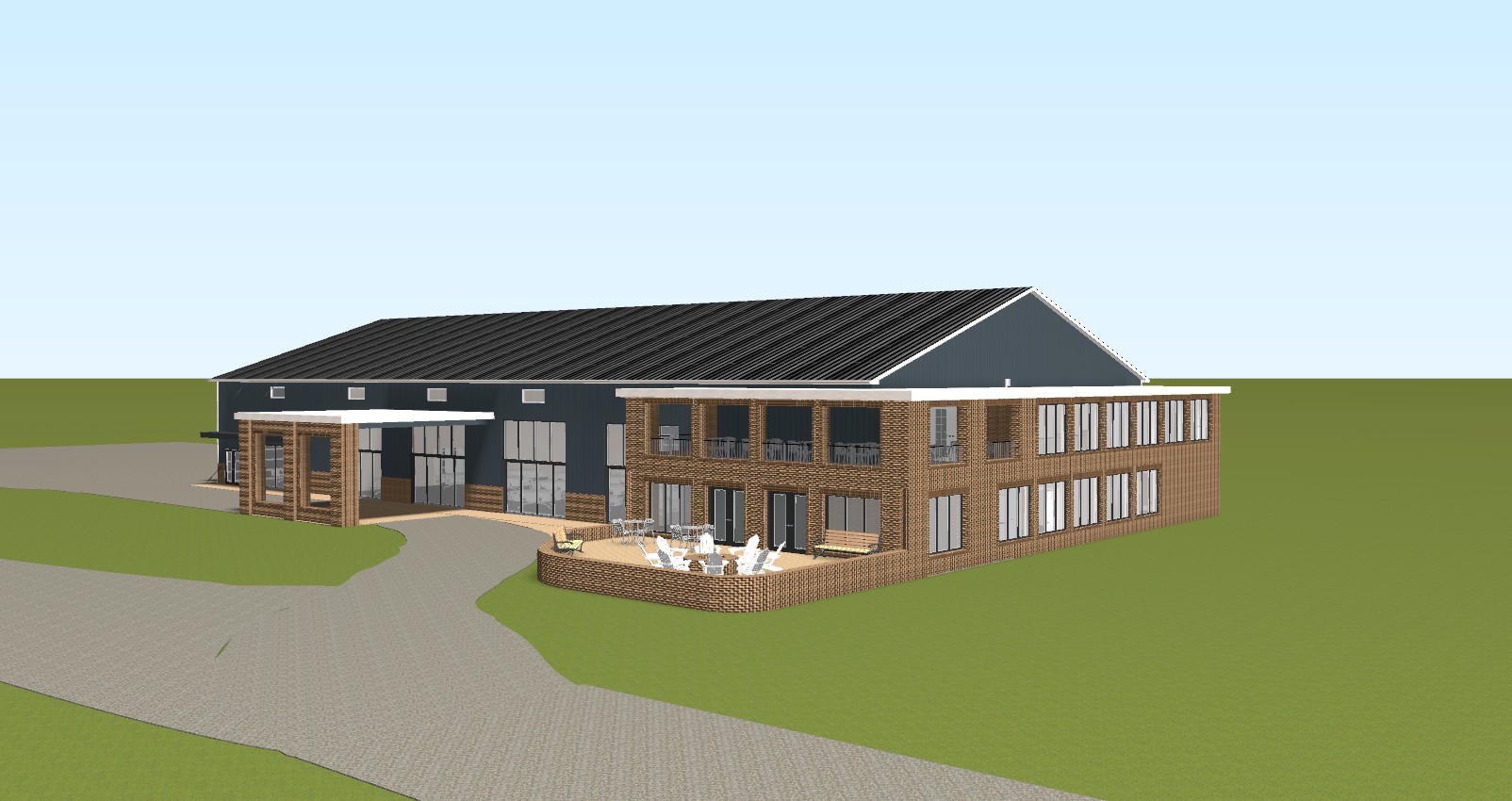 enhance this image add extensive landscaping around building place in central ohio in october building to face south at 4 30 pm with a tree line in the background