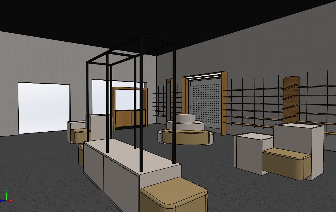 make photo realstic add track lighting to ceiling add shoes to display and add in a person to give scale