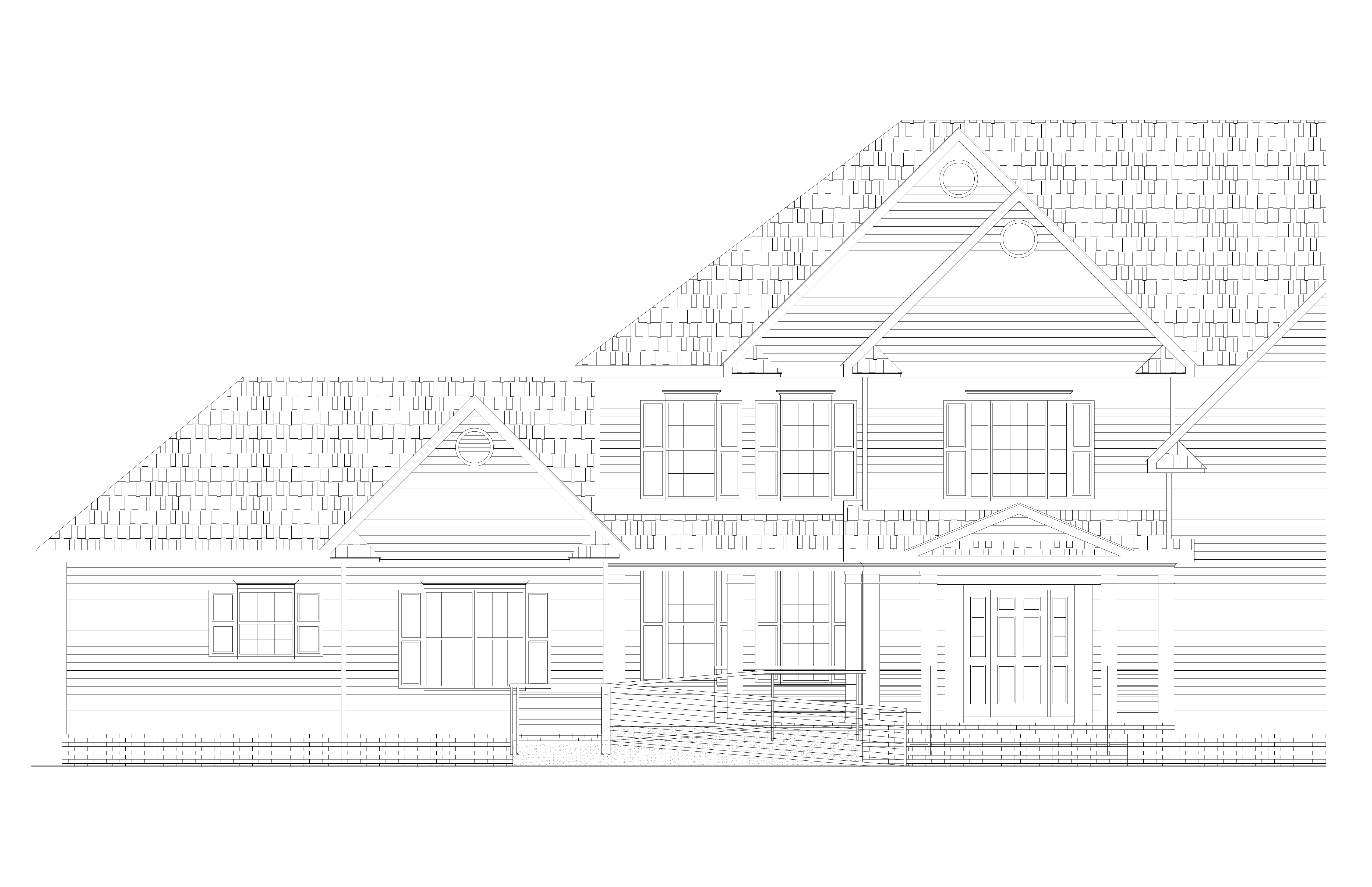 render a beautiful suburban house with a traditional design featuring a gabled roof the roof is covered with dark gray shake shingles the exterior walls are painted in a soft warm beige with white trim around the windows and doors the front door is black and the shutters on the windows are black the porch has white pillars and a light wooden floor the brick foundation is a classic red orange color there is a handicap ramp to the left of the door the atmosphere is serene and inviting with a clear blue sky overhead and warm natural sunlight casting gentle shadows