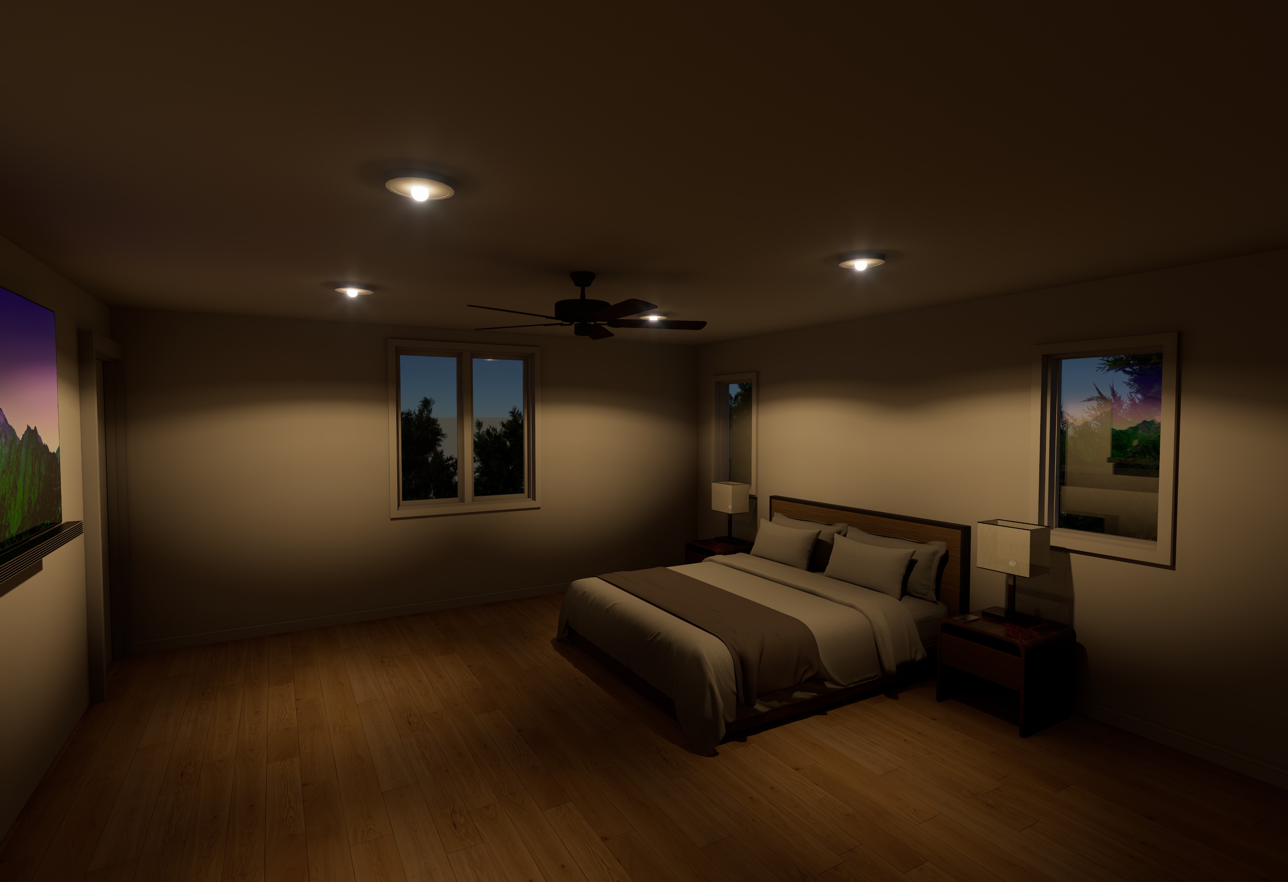 ultra photorealistic real estate interior photo of a modern bedroom preserve exact layout furniture placement bed position nightstands ceiling fan and lighting locations no redesign or structural changes midday natural lighting coming through windows soft balanced exposure neutral color tones subtle modern coastal aesthetic with light airy styling add minimal wall artwork coastal abstract neutral tones and a few natural plants placed realistically in the room physically accurate materials and lighting realistic global illumination soft shadows natural light bounce real world imperfections slight fabric wrinkles subtle texture variation minor surface wear realistic wood grain soft dust and smudging shot like a zillow listing photo 24mm wide angle lens eye level composition evenly lit no dramatic shadows no stylization no cinematic effects no over sharpening true to life colors hdr balance without blown highlights slight lens distortion very subtle grain 8k detail highly realistic indistinguishable from real photography