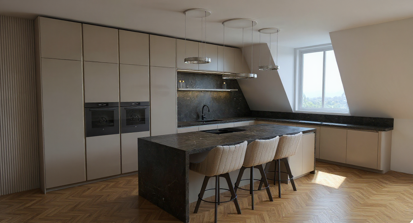 lower cabinet on the left side contained with the green marble should be glossy dark green rest of the kitchen furniture doors should be dark brown but not wood finish