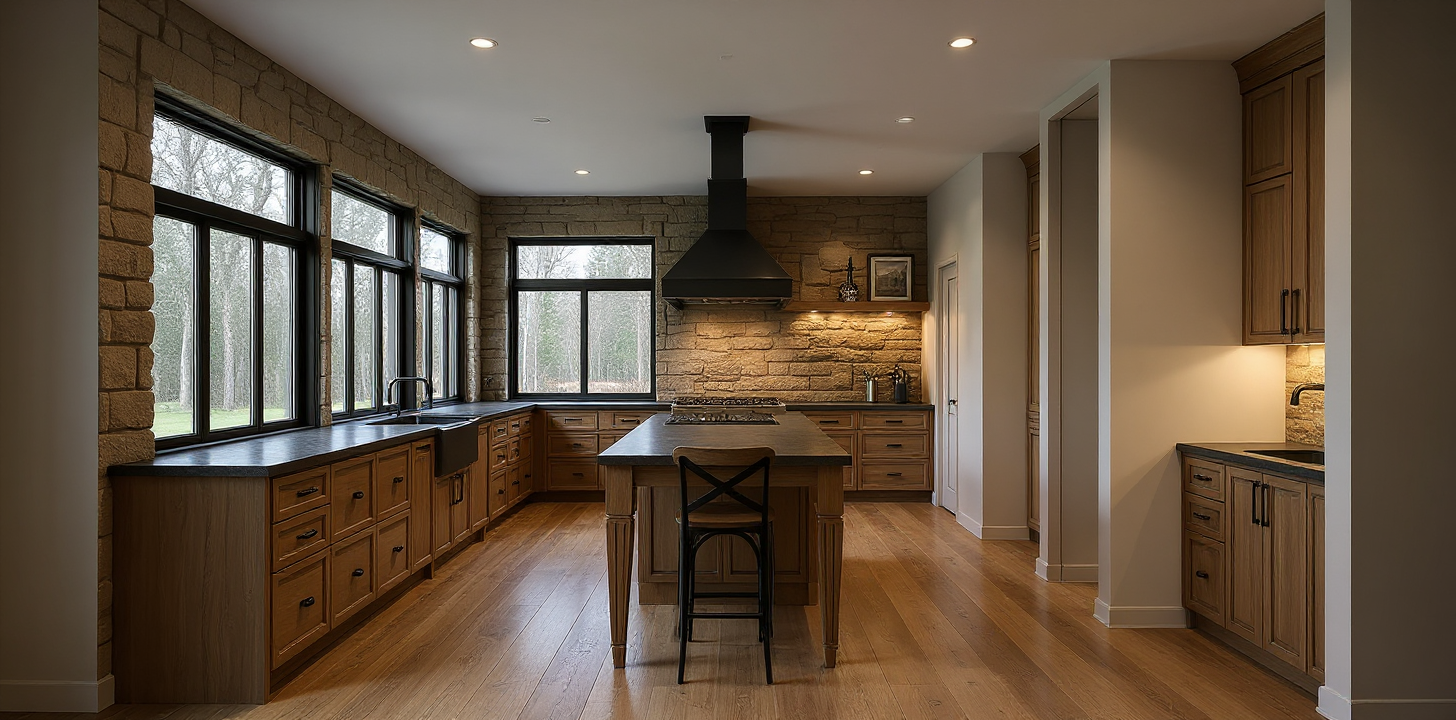 add rustic stone backsplash add rustic black hood vent