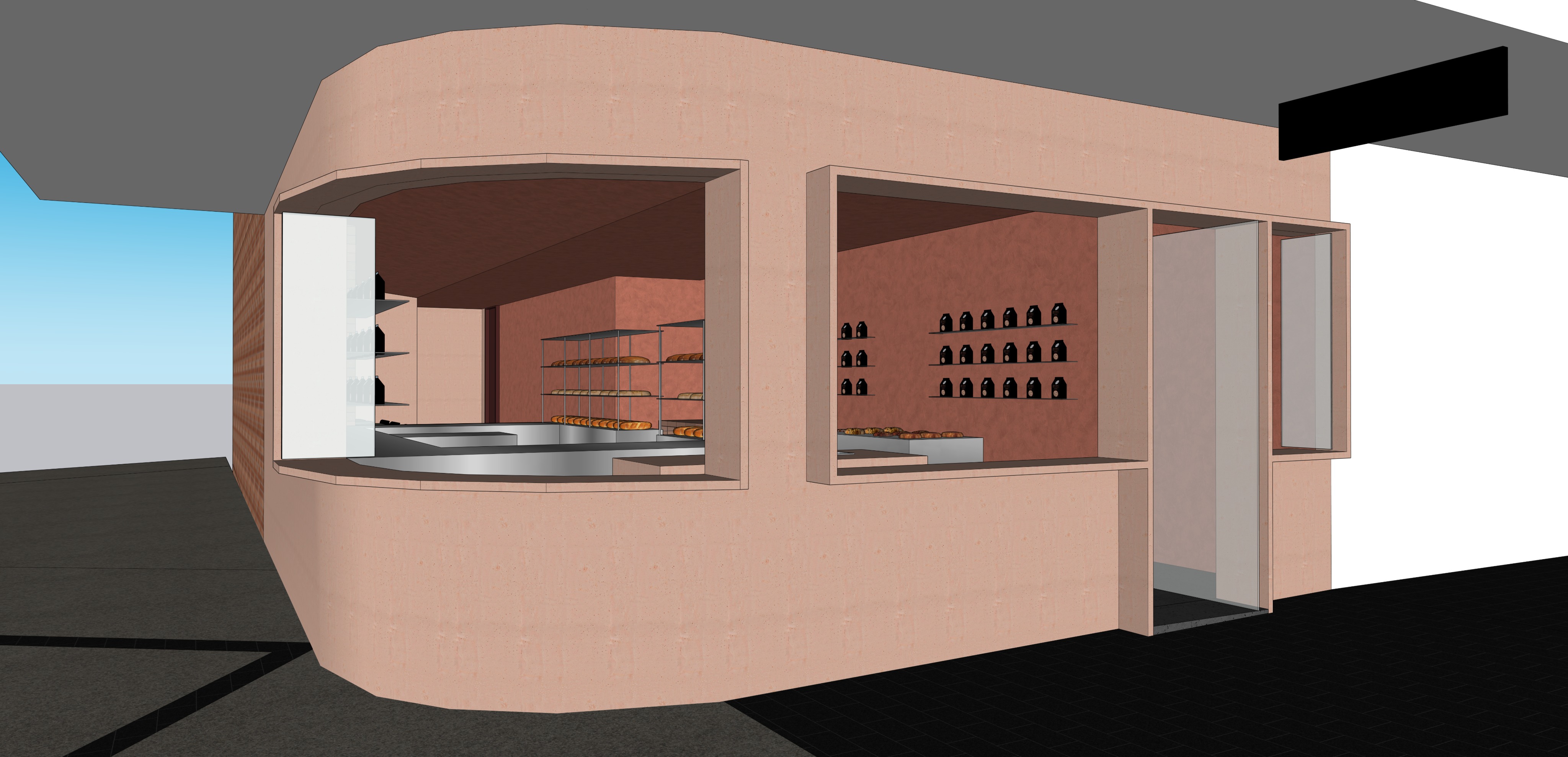 update this image showing an interior of a small boutique bakery on the corner of a quiet australian city suburb street the view of the bakery is from the street outside and looks directly onto the corner of the shop it is gloomy and rainy outside the corner itself has a curved profile the entrance is on the right of the corner and is designed thoughtfully bleeding interior into exterior there is an awning over the entrie shopfront the interior design explores themes of insertion and reveal bakery displays are minimal and industrial in appearance the interior is hip minimalist industrial and feels like a dark sombre inviting and warm art gallery sophisticated but simple lighting spacious refined minimalism using craftsmanship the space is warm intimate and architectural with terracotta tile flooring reddish clay plaster walls with dark stained timber or stainless steel cabinetry minimal monolithic espresso counter design is a simple rammed earth rectangular block with a wafer thin stainless steel counter top behind the counter a few open stainless steel shelving displays bread and pastries in a restrained curated way a luminous wall panel diffuses soft warm light creating a calm gallery like atmosphere above the counter the bakery feels sculpted rather than decorated simple geometry heavy planes deep reveals and carefully framed views a built in bench runs along one wall materials feel tactile and honest clay wood stone matte metal the colour palette is warm rust brown clay and soft amber light dark intimate sombre the shop front is not entirely open nor is it entirely glass but has articulation that defines it beautifully on the street