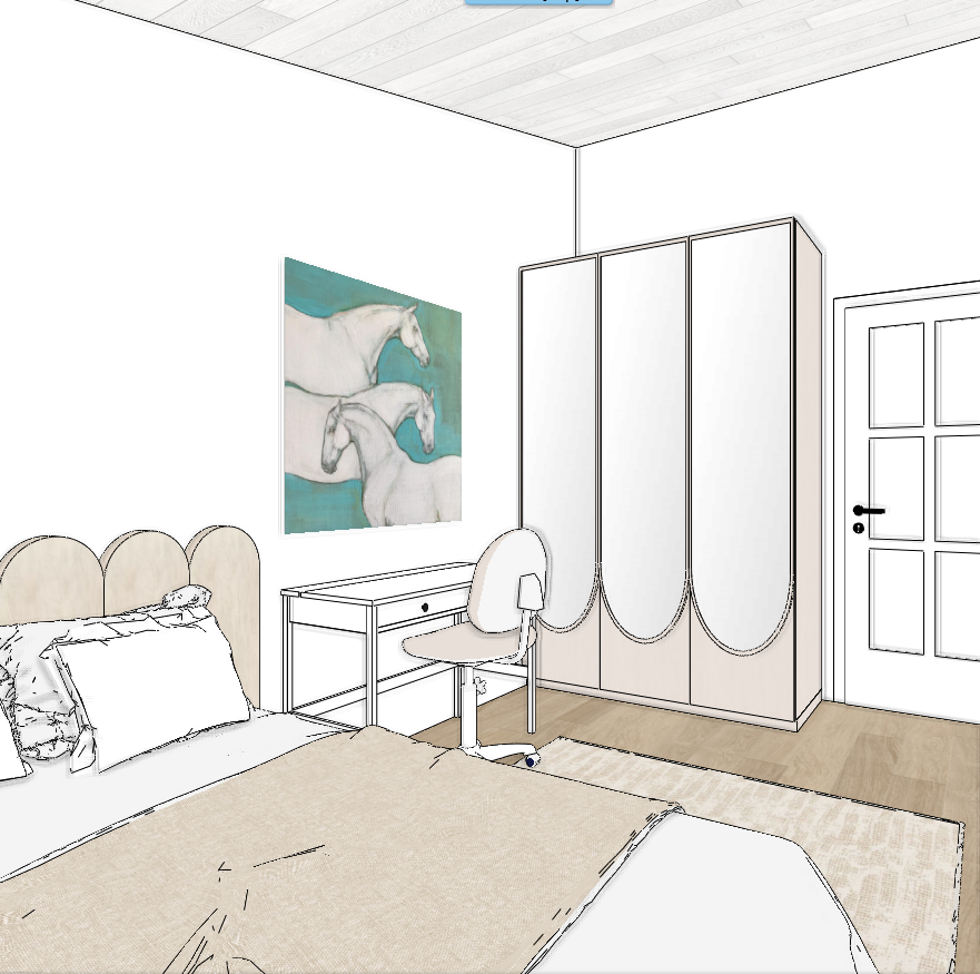 scallop headboard around the bed is upholstered in light beige boucl fabric not wood ceiling is white painted wood walls are white downward scallop detail on wardrobe door is mirror