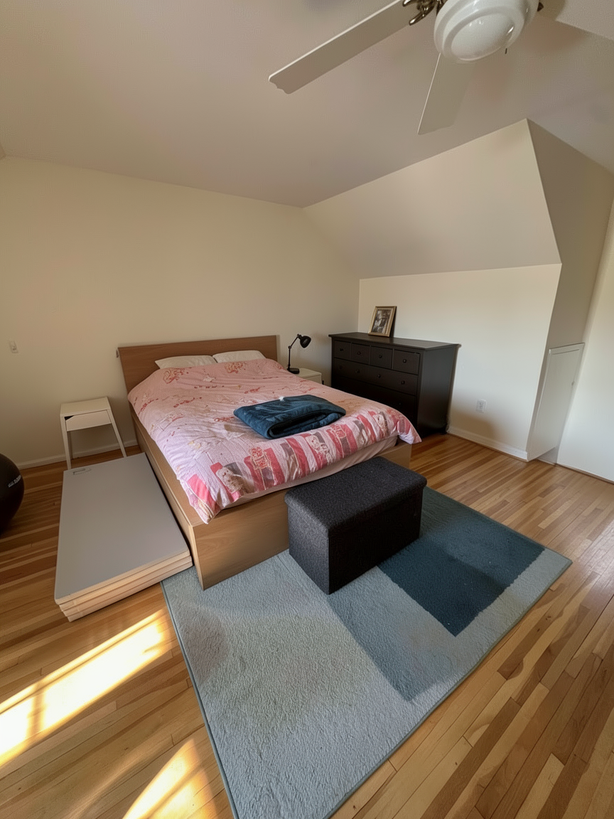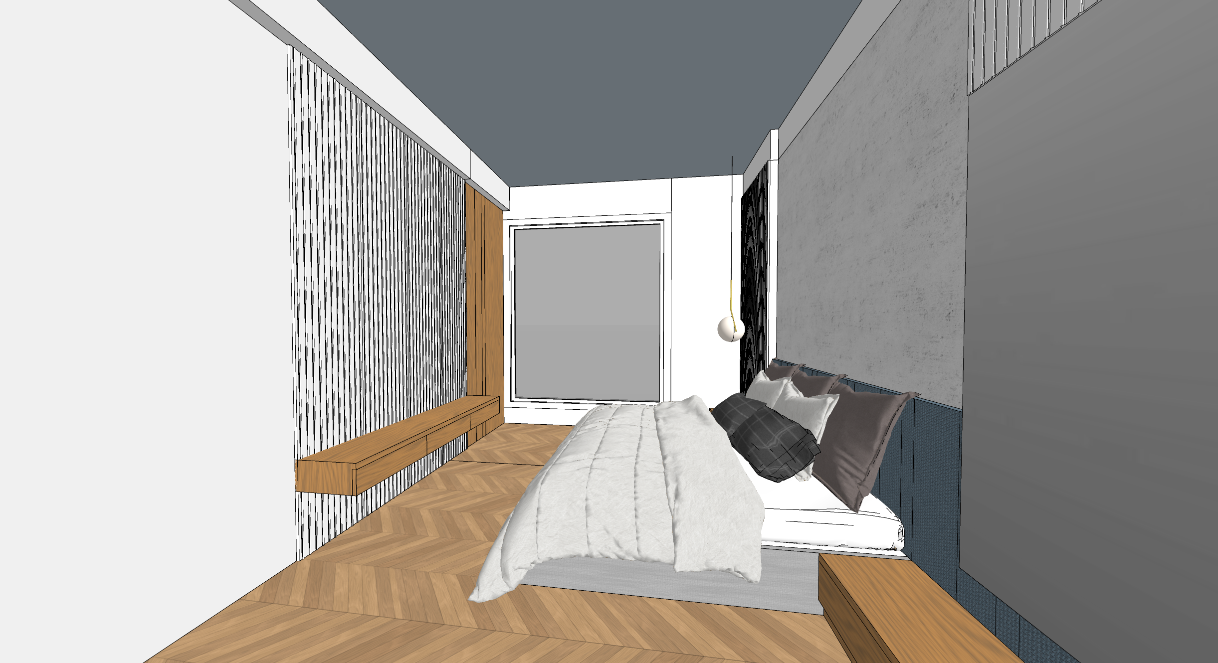 realistic rendering of modern bedroom with beautiful view thru the window which has translucent curtains i will be looking at buildings and sunset as the apartment is on the 13th floor