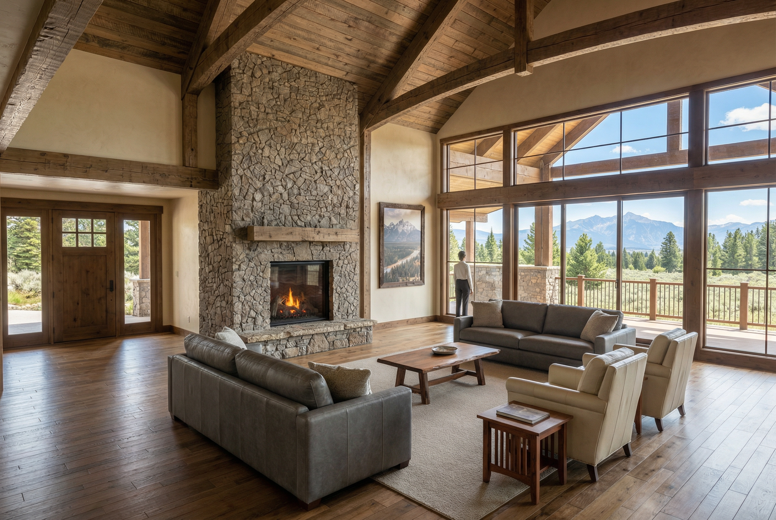 geometry lock highest priority treat the input as a strict elevation reference do not change the shape of the structure in any way do not modify resize reposition or redesign any windows or doors keep all window and door proportions mullions and alignments exactly as shown do not alter rooflines corbels timbers or structural elements materials enhance only keep exact placement maintain all materials exactly as designed do not reinterpret or relocate them lap siding realistic ghost wood siding jackson hole style same locations rock on walls keep exact pattern and layout increase realism only foundation replace all visible concrete with realistic rock veneer roof copper standing seam lighting render quality golden hour exterior lighting warm interior glow visible through windows realistic shadows depth and material texture site environment montana open field setting with native montana vegetation no trees on left no trees on right trees only far in the distance small mountain far in the distance to the right terrain left side slopes slightly upward drops off to the right hardscape keep design intent exact rock slab patio at front patio steps down to the right of the porch patio wraps around to the front of the deck patio extends to the far back corner of the upper deck add firepit on patio foundation walls should show rock only no exposed concrete final instruction enhance realism only do not redesign reinterpret or adjust any architectural elements preserve the exact structure window and door sizes and overall proportions