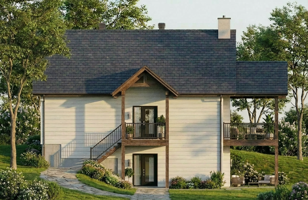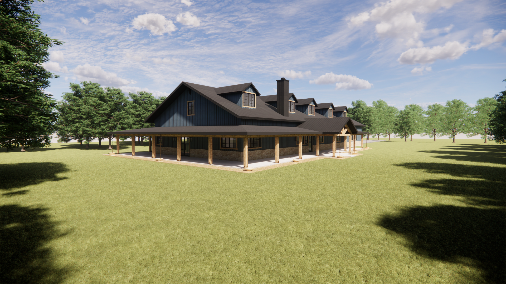 photorealistic architectural rendering of a large modern ranch style barn house located in weatherford texas maintain the exact building geometry rooflines dormers porch layout column spacing and massing exactly as modeled do not modify the architecture proportions or layout exterior materials exterior walls clad in deep blue standing seam metal wall panels matte finish with crisp vertical seams and subtle metal reflectivity panels should appear as real architectural metal siding with straight seams and natural shadow depth roof finished in matte black standing seam metal roofing the roof color must be solid black metal not blue and not gray standing seam roof panels must be perfectly straight rigid and evenly spaced running from ridge to eave with parallel seam lines and consistent spacing 16 18 inch panels roof planes should appear perfectly flat and planar with no warping rippling bending or distorted seam lines the roof should look like professionally installed standing seam metal roofing panels with crisp mechanical seams and clean straight panel alignment porch columns beams trim and gable accents made from warm natural cedar wood rich amber brown tone with visible wood grain and natural variation base of the building clad in dark texas ranch moss rock stone veneer large irregular fieldstones with deeper brown charcoal gray and weathered tan tones stones should appear rugged and dimensional with deep recessed mortar joints and strong shadow lines typical of heavy ranch style moss rock construction in north texas avoid light cream or pale limestone tones windows with dark bronze or black frames rendering quality ultra realistic architectural visualization using physically accurate materials high resolution textures global illumination realistic reflections and natural shadows professional architectural photography style using a 35 50mm architectural lens environment and site set in rural parker county weatherford texas terrain with gently rolling ground native grasses limestone soil tones and scattered live oak and post oak trees natural ranch landscape with minimal landscaping and realistic ground textures lighting warm late afternoon texas sunlight with soft shadows under the porch and balanced sky exposure material realism materials must appear highly tactile and realistic visible cedar grain rugged dark moss rock stone with deep shadow lines and crisp metal standing seam panels important clarification the walls are blue standing seam metal while the roof is matte black standing seam metal roofing the roof seams must be perfectly straight evenly spaced and parallel with no warping or waviness and the roof surfaces must appear flat and planar like real metal roofing panels surfaces should look like real construction materials on a completed ranch house in texas not cgi