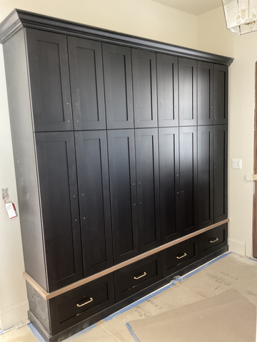 do not change the cabinets in any way preserve the exact cabinet colors materials finishes dimensions door and drawer styles hardware spacing alignment and all geometry exactly as shown do not alter the countertop shape backsplash appliances flooring lighting fixtures or wall structure only remove the construction materials clutter and mess from the scene clean the room and make it look finished and staged add a few simple tasteful home accessories appropriate for the style of the space but do not add or remove any furniture windows or architectural elements maintain the original lighting direction and realism enhance clarity and polish the photo while keeping the cabinetry and room design completely unchanged do not alter the lighting to keep the cabinet colors as they are in the image add new flooring add new gold cabinet pulls to all silver dots on the cabinet doors stage the floor for a mudroom remove light fixture in top right corner do not change the cabinet layout at all