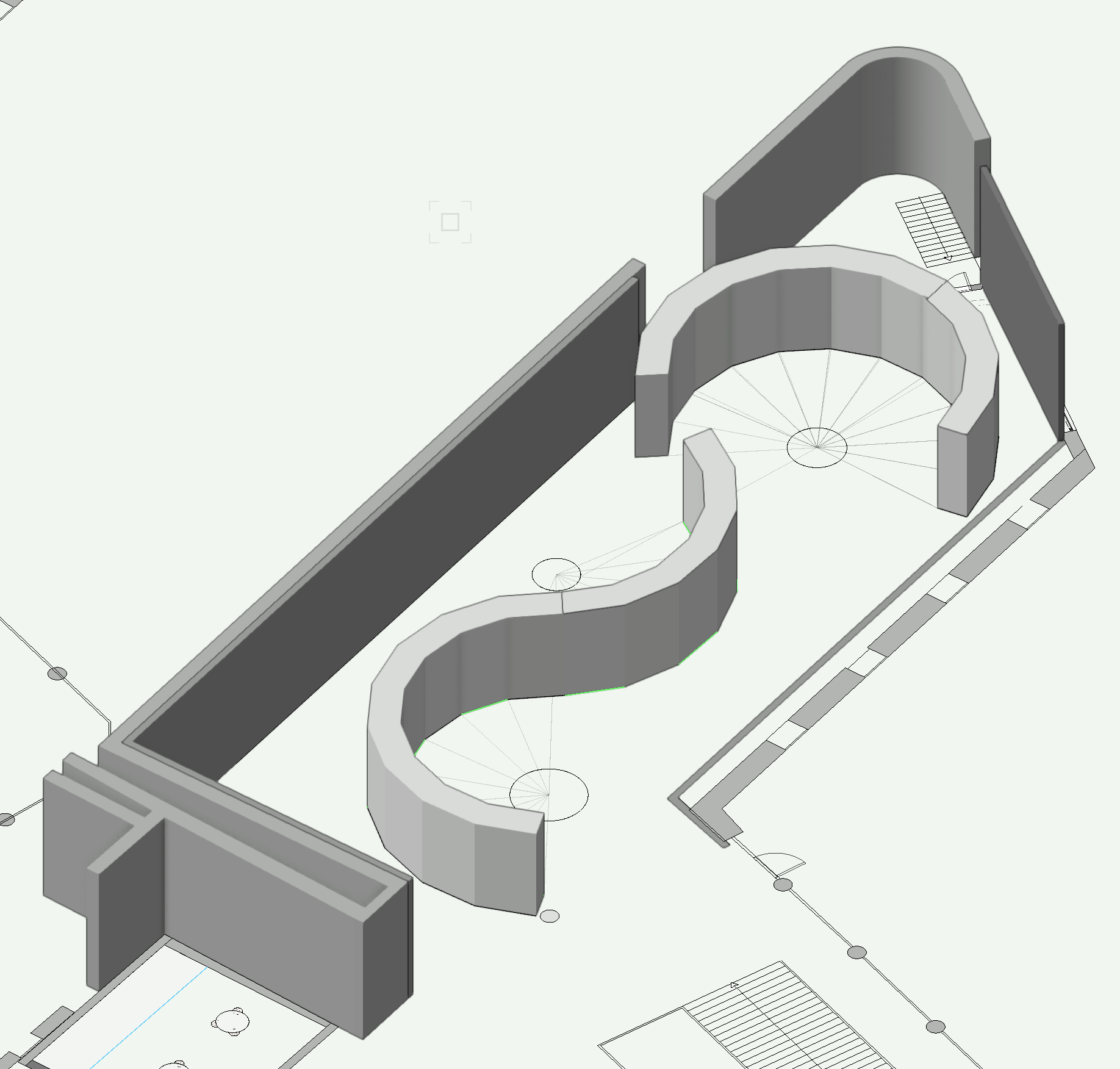 exterior shot replace curved wall with parametric wooden lattice structure made of repeated cubic frames approx 40 60 cm module maintain original footprint but dissolve solid mass into porous grid system include integrated display surfaces and platforms allow multiple visual axes and permeability style exhibition scaffolding nordic wood open framework
