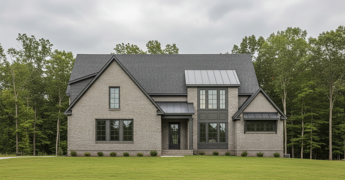 gray brick dark trim wooded background cloudy sky simple landscape manicured lawn mirrored windows