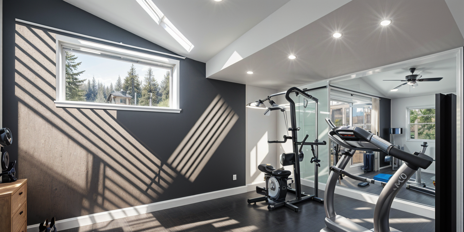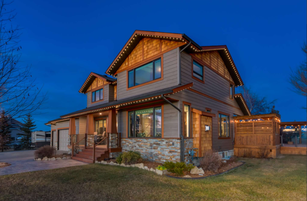 modernist interior shot older bc home exterior with wood lap siding painted in muted blue white window trim slightly weathered look surrounded by cedar trees cloudy sky realistic west coast atmosphere architecture