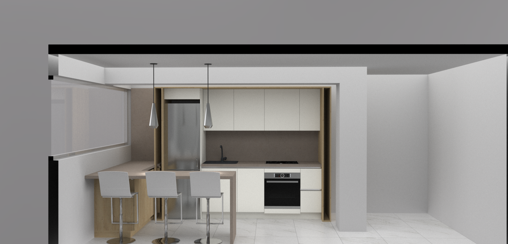 i want to put element object and to be more natural render a modern kitchen interior with a minimalist aesthetic use warm oak wood for the cabinets and shelving paired with a clean white countertop the bar stools should be sleek with chrome legs and white seats the walls are a soft beige providing a gentle contrast to the white ceiling the floor is adorned with polished white marble tiles with subtle gold veining the atmosphere is bright and airy with soft natural lighting streaming in from large windows on the right side contributing to an open and inviting space