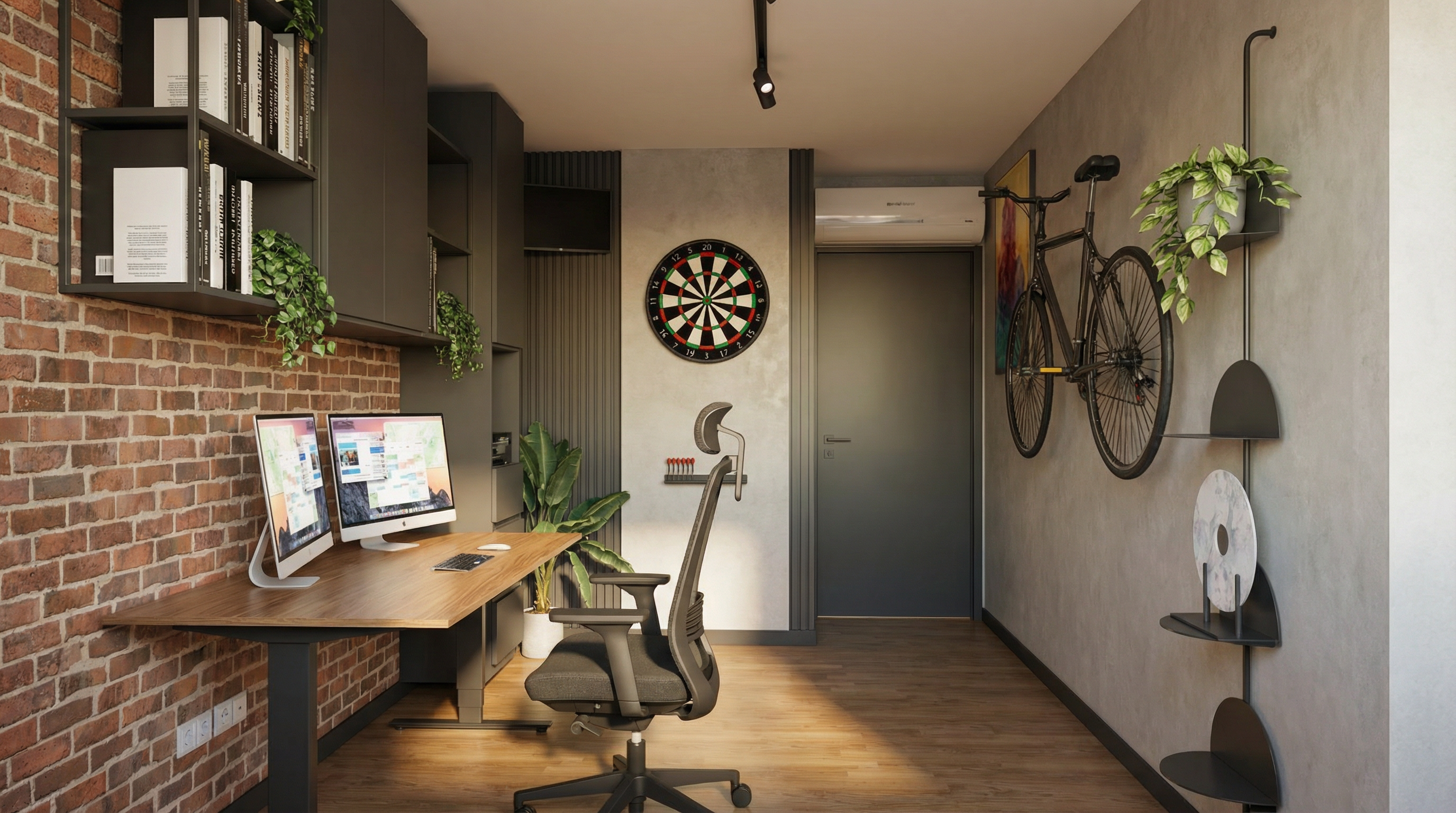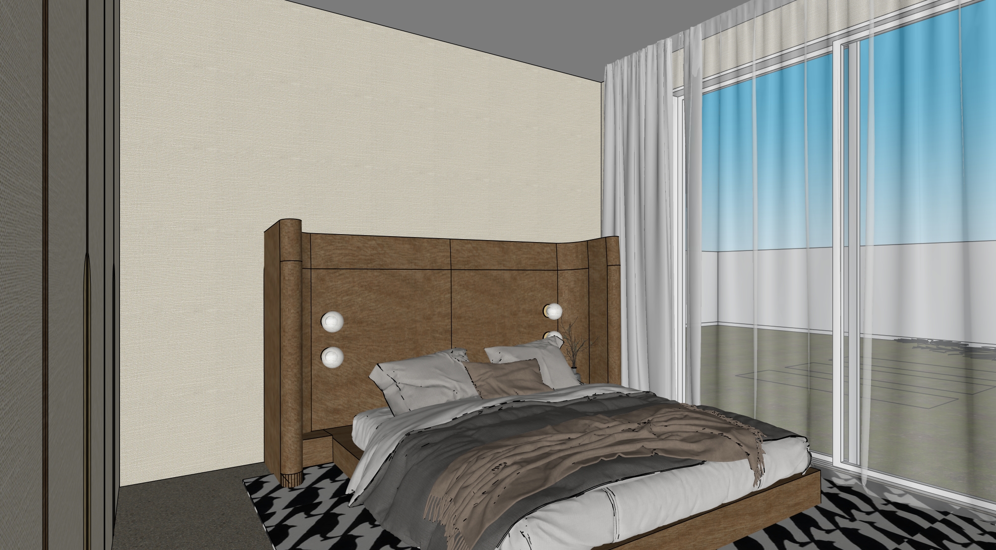 render a photorealistic rendering with the view as is just enhance the look of the existing materials bed frame is walnut wood rug pile height is low