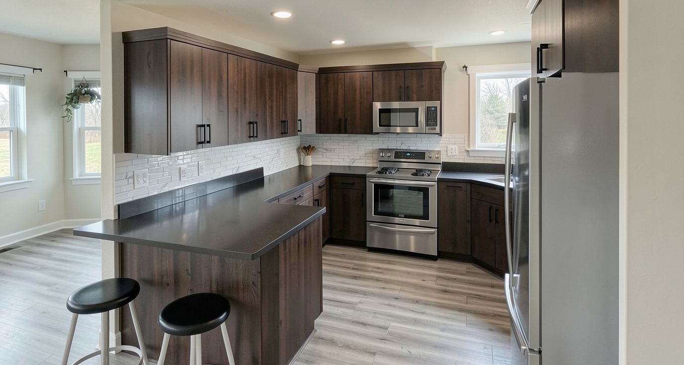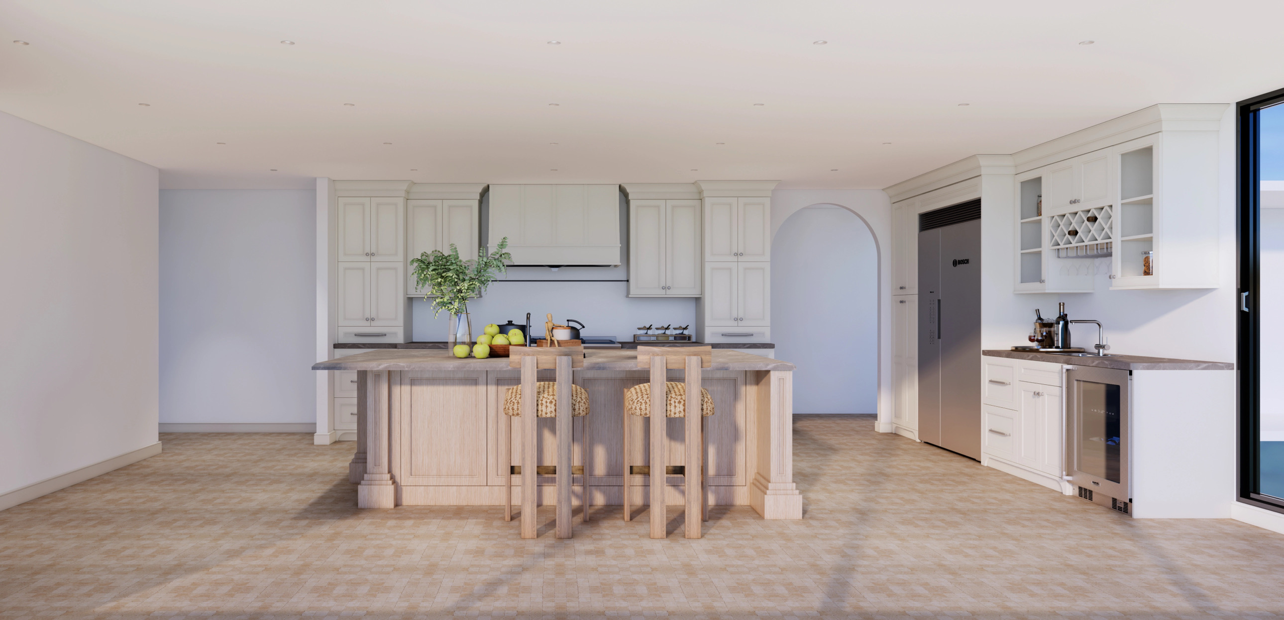 change floors to 8inch wide plank white oak remove the items on the kitchen island countertop and all other countertops remove the counter stools at the island add two 17inch wide shaded pendant lights with silver hardware above the island make the countertop also the backsplash on the walls