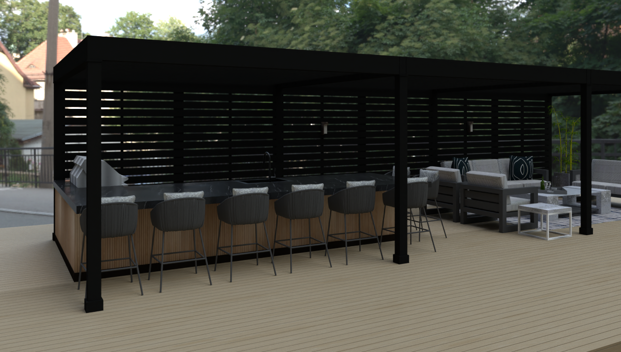 ultra realistic modern outdoor pergola bar in a suburban backyard bright natural daylight soft overcast sky realistic hdri environment lighting matte black powder coated steel frame with subtle reflections dark stone countertop with soft natural reflection vertical timber bar cladding with realistic grain texture woven fabric bar stools outdoor lounge seating with textured cushions horizontal slatted privacy wall landscaped backyard with trees and neighboring houses softly blurred in background shallow depth of field realistic shadow softness global illumination ambient occlusion physically based rendering architectural photography eye level camera 35mm lens natural exposure photorealistic high detail 8k