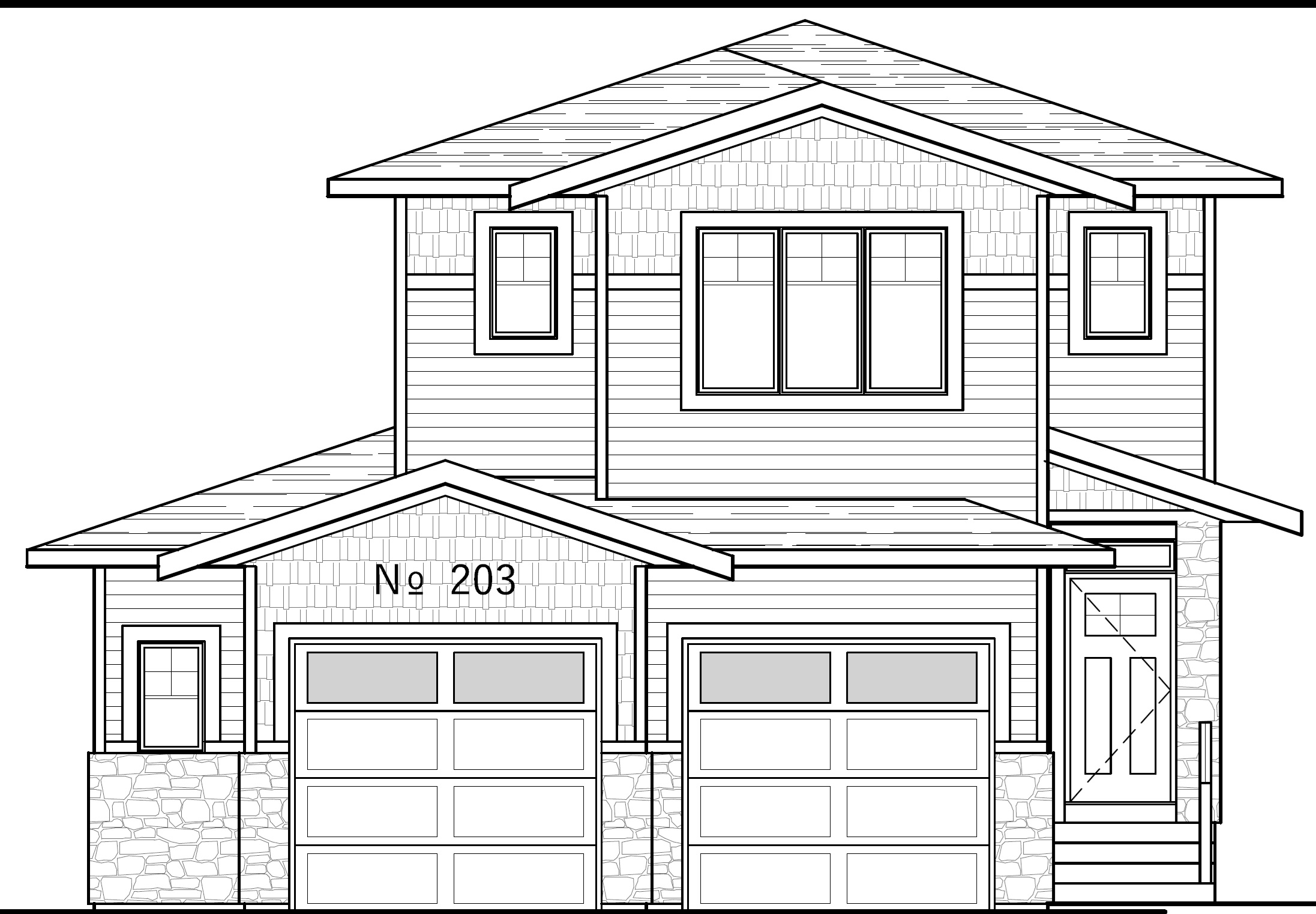 render this home home to have white siding and white shakes as per plans windows are to be black house number is to be black natural light coloured stone to compliment the white siding
