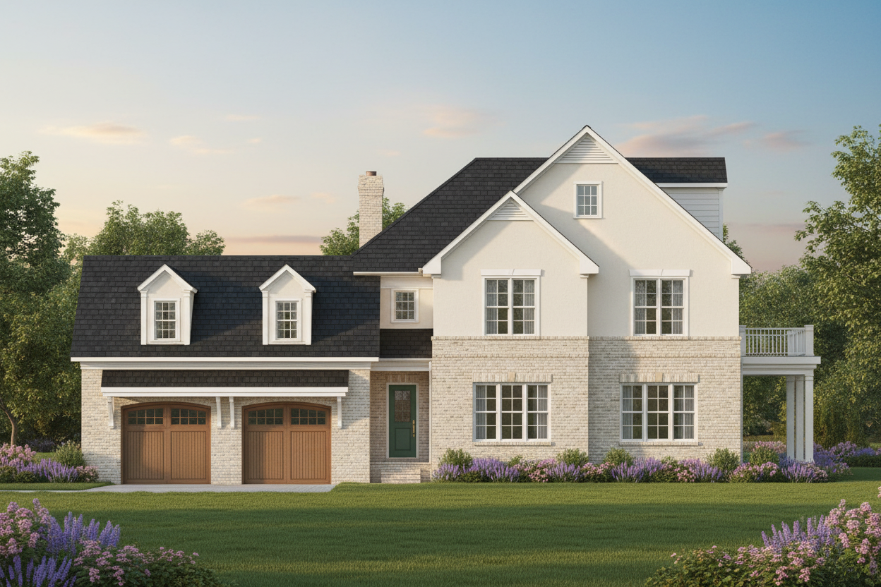 side elevation craft a serene and picturesque scene of a classic two story house with a symmetrical facade and gabled roof render the roof in rich slate black shingles giving it a textured appearance the exterior walls are painted in a soft cream color with brick accents in a warm rustic cream large windows framed in white invite a welcoming ambiance the side door stands out in a deep forest green with elegant brass handles surround the house with a lush garden vibrant green grass and blooming flowers in shades of lavender and pale pink the sky is painted in a gradient of soft azure transitioning to a warm golden hue suggesting a tranquil evening atmosphere add soft ambient lighting to emphasize the cozy and inviting nature of the home
