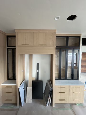 do not change the cabinets in any way preserve the exact cabinet colors materials finishes dimensions door and drawer styles hardware spacing alignment and all geometry exactly as shown do not alter the countertop shape backsplash appliances flooring lighting fixtures or wall structure only remove the construction materials clutter and mess from the scene clean the room and make it look finished and staged add a few simple tasteful home accessories appropriate for the style of the space but do not add or remove any furniture windows or architectural elements maintain the original lighting direction and realism enhance clarity and polish the photo while keeping the cabinetry and room design completely unchanged do not alter the lighting to keep the cabinet colors as they are in the image add a subzero built in fridge in the opening with stainless doors