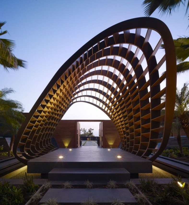 integrate a bach club with a restaurant and tables the design should blend seamlessly with the existing environment featuring innovative shapes and dynamic forms characteristic of parametric architecture highlight the club s welcoming atmosphere unique totems and the coexistence of music dining and modern design elements lot of glass and wood architecture