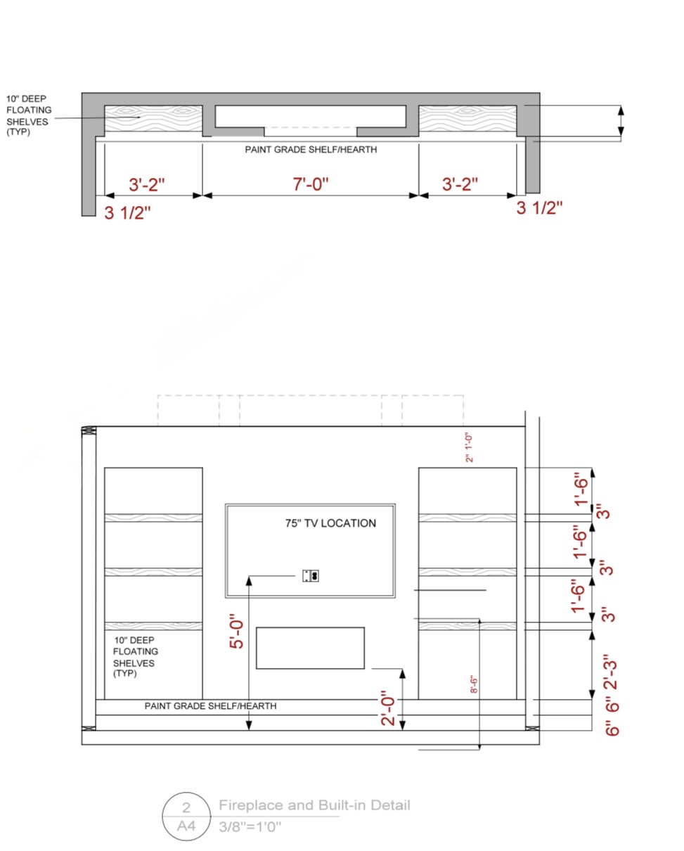 create a 3d model of the attached fireplace and shelving detail the shelves are stain floating shelves the hearth extends 2 betyond the drywall and the walls are painted white