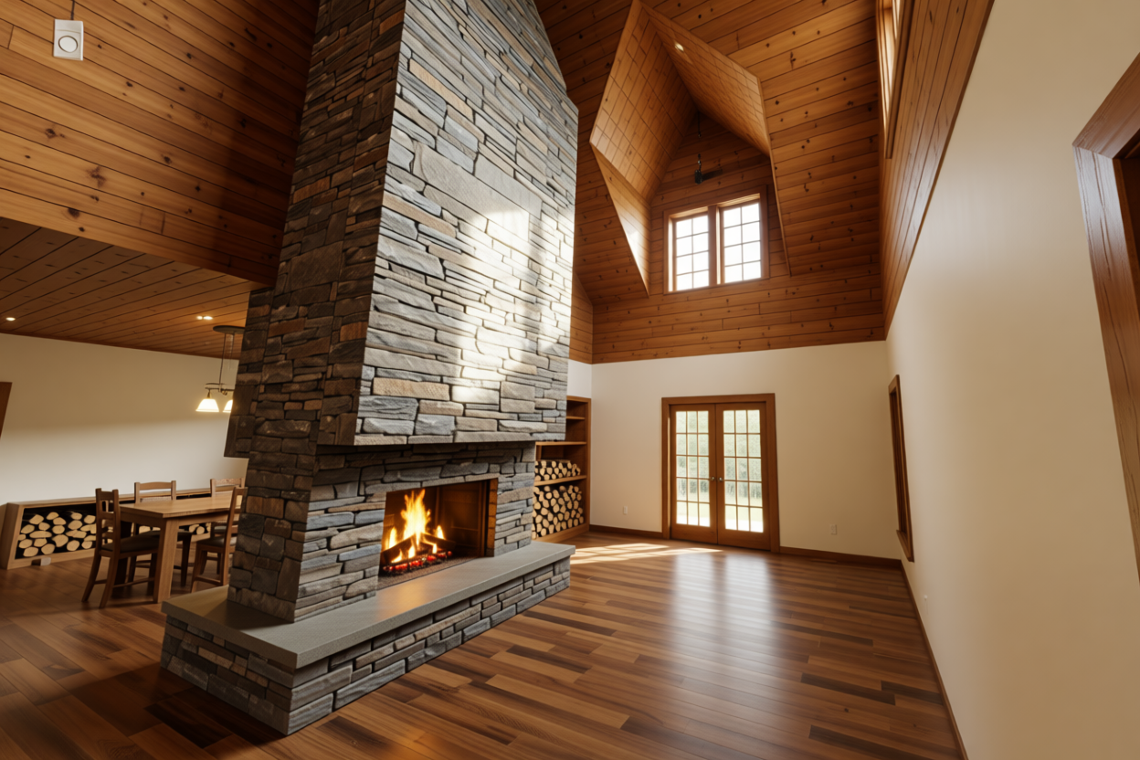 mahogany deck step down to a concrete patio with sloped board and bead ceiling with wood beams and decorative fieldstone columns and a fireplace in the rear with a fieldstone surround and mantle with board and batten walls one either side include a seating group on the deck and a seating group on the patio the house will have yellow horizontal siding