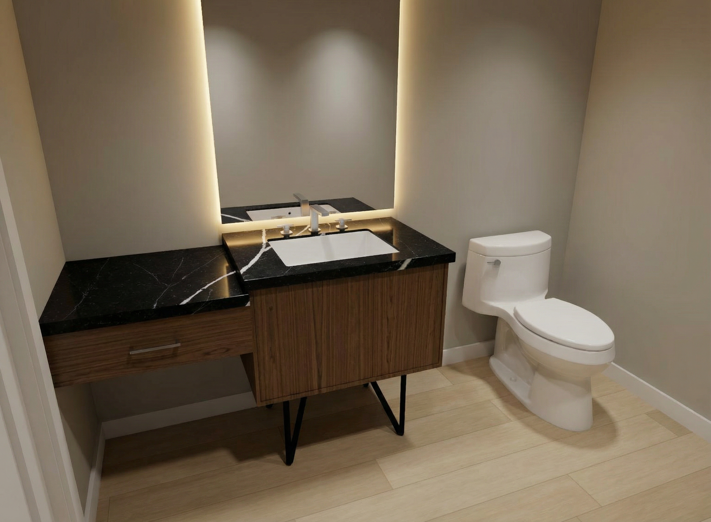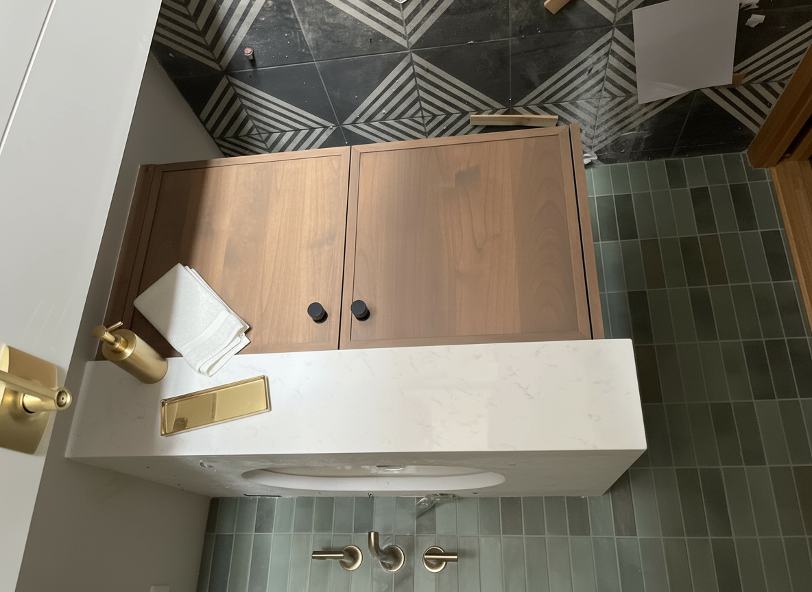 remove everything on the floor remove everything on the countertop restage the countertop with gold accents get rid of the door handle