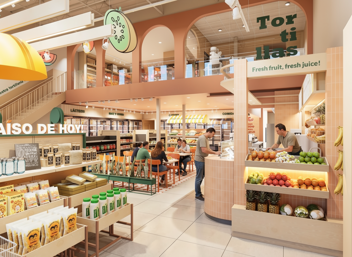 recolor this retail interior render to create a bold high contrast tropical latin market atmosphere using the para so tropical brand colour palette keep the architectural geometry furniture layout lighting positions and camera angle unchanged only modify materials finishes and colour application colour application strategy architectural arches structural frames replace existing peach tones with deep green pantone 561c 00594c in a matte painted finish feature walls vertical planes introduce medium tropical green pantone 7724c 00966c on selected focal walls to create layered contrast juice bar service counter apply tropical orange pantone 144cp f7911d to vertical cladding panels or tile surfaces integrate yellow pantone 7549cp fdb200 as accent trims or canopy elements signage graphic elements use vibrant red pantone 1788c ea1d33 selectively in branding graphics and typographic highlights to create visual punch seating loose furniture accents introduce controlled pops of yellow and red for contrast while keeping balance millwork shelving maintain light natural wood texture for warmth but reduce beige and desaturated tones in surrounding finishes increase colour saturation and contrast overall reduce neutral dominance keep warm ambient lighting but enhance vibrancy so fruits and fresh products look vivid and fresh the final environment should feel energetic joyful contemporary tropical and visually impactful a colourful latin retail destination with strong brand identity and high contrast