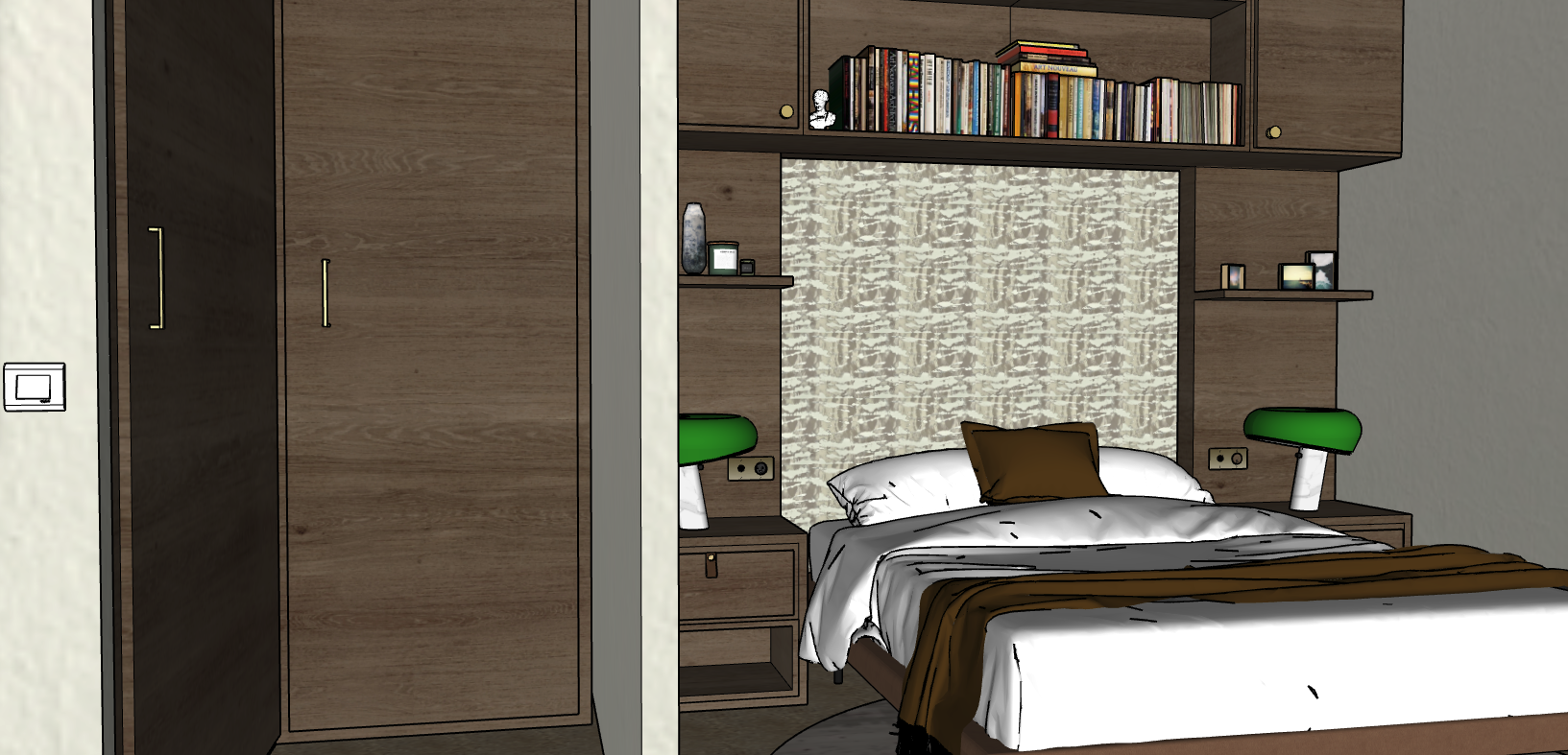 elegant bedroom natural light from the right side of the frame there is no bupholstered headboard the light from the selling is paper white keep the wall paper in the middle of the frame and the same bdside table lamp from the previous render