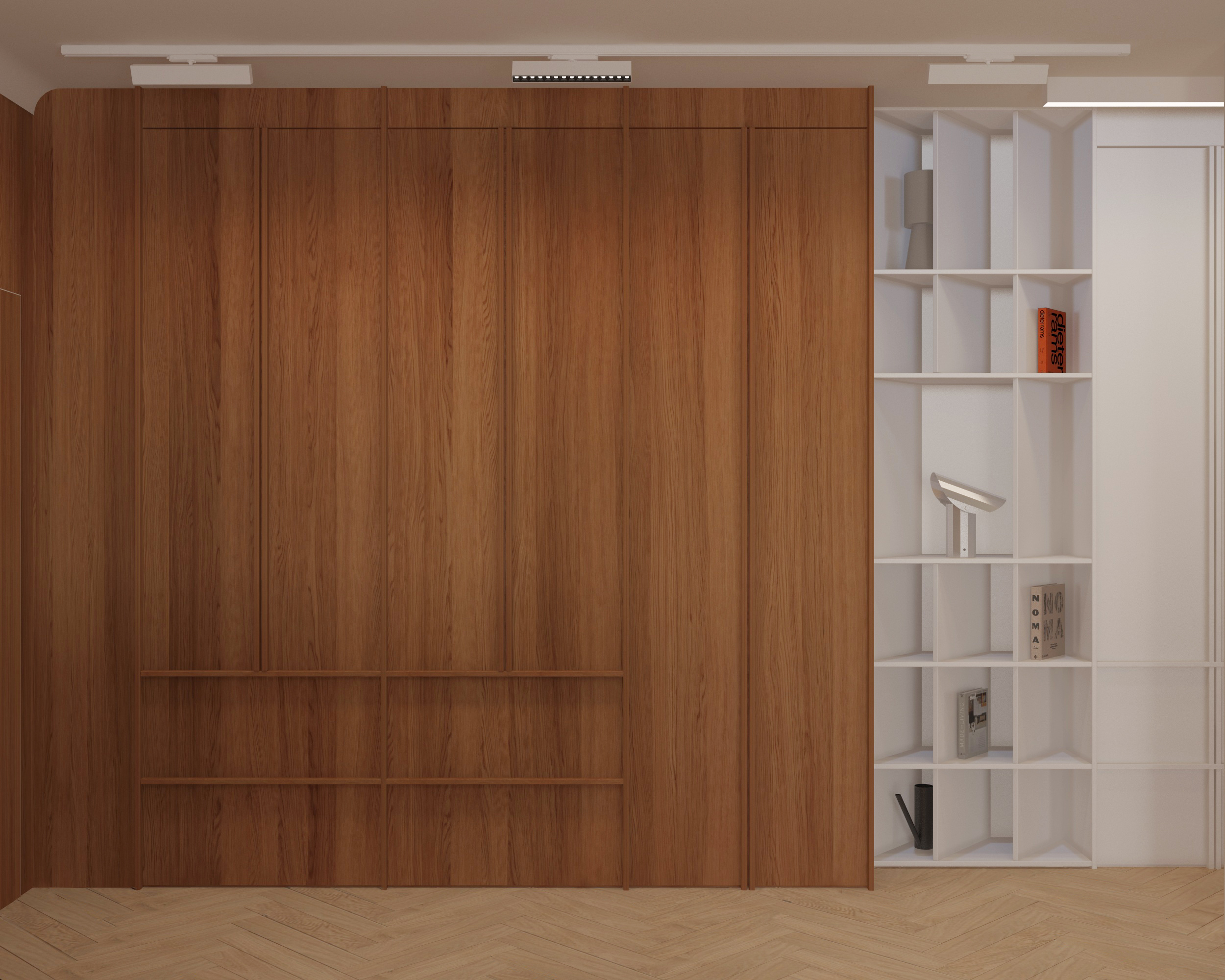 transform this 3d view into a high end photorealistic architectural render add a little natural sunlight entering from the back of the camera creating soft shadows and realistic light bounce but keep the whole image light and not too warm office vibe with a little domestic atmosphere the ceiling both with the cabinets on the whole wall on the right side should be light beige color enhance material detail realistic reflections global illumination and natural color balance keep the original geometry and camera angle unchanged